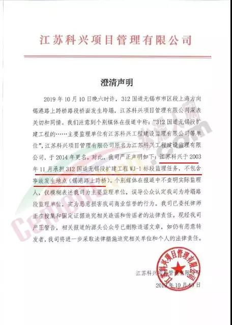另一家名為江蘇科興項(xiàng)目管理有限公司的項(xiàng)目監(jiān)理公司也發(fā)布了類似的澄清公告。稱其承擔(dān)的312國道無錫段擴(kuò)建工程監(jiān)理任務(wù)中,不包括事故發(fā)生地 點(diǎn)(錫港路上跨橋)。