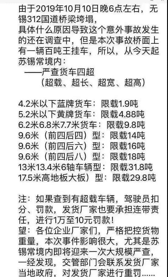 另外一個(gè)原因是由于市場(chǎng)競(jìng)爭(zhēng)因素,現(xiàn)有的重載貨車如果不超載很難盈利。這在如今去產(chǎn)能、制造業(yè)競(jìng)爭(zhēng)壓力大的情況下,想提高貨運(yùn)行業(yè)的收入杜絕超載現(xiàn)象是非常難的。對(duì)于超載貨車罰款后繼續(xù)放行,也給橋梁造成了很大的安全隱患。另外一個(gè),大家很感興趣的是這次事故和臺(tái)灣近期事故的對(duì)比。專家認(rèn)為,無論是從橋的重要性,還是從暴露問題的嚴(yán)重程度,兩者都是不可相提并論的。無錫這次垮塌的橋是一座跨度二十多米的高架簡(jiǎn)支梁橋,臺(tái)灣是一座140多米的拱橋。前者是一個(gè)很普通的工程,相當(dāng)于一座普通的三層洋房,后者則是一個(gè)地區(qū)的重點(diǎn)標(biāo)志工程,肯定是進(jìn)行了詳細(xì)的安全性研究和重點(diǎn)的審查,無錫事故的傷亡更少,事后想要重建也更為容易,重新把梁架上去就好,臺(tái)灣的拱橋沒個(gè)兩三年無法修復(fù)。橋梁側(cè)傾問題在國(guó)內(nèi)這些年頻繁發(fā)生,因?yàn)樵O(shè)計(jì)時(shí)普遍存在類似缺陷,業(yè)界也有心理準(zhǔn)備。而臺(tái)灣的問題要嚴(yán)重得多,是主要受力構(gòu)件的強(qiáng)度破壞,熟悉土木工程的人應(yīng)該知道這是一個(gè)多么恐怖的概念,因?yàn)閺?qiáng)度要求是最容易滿足的。連強(qiáng)度要求都無法滿足,這座橋梁的質(zhì)量問題無法想象??戳松鲜鍪鹿史治?,小編也有些懵懂了,在很多城市,市區(qū)的道路是不允許大貨車通行或者限制時(shí)段通行的。這些大貨車是如何開上市區(qū)道路的?行進(jìn)在橋梁之上的呢?超載事故頻發(fā), 兩個(gè)月造成41人死亡,57人受傷近期因道路交通事故頻發(fā),各區(qū)域都在有針對(duì)性的進(jìn)行超限的治理。水泥物流更是從源頭就加大了治超的力度。“百噸王”們是如何走出廠門又堂而皇之的上了路的呢?近期多起道路交通事故都是源于貨車超載,查超治超由來已久,為何屢禁不止呢?在剛剛過去的不到兩個(gè)月的時(shí)間內(nèi)已經(jīng)連續(xù)發(fā)生多起營(yíng)運(yùn)客貨車事故,共造成41人死亡57人受傷。血淋淋的數(shù)字,與其說是車禍猛如虎,不如說都是超載惹的禍!9月3日16時(shí)許,一輛豫QE3683號(hào)重型牽引半掛車沿S220省道行駛至河南省駐馬店市驛城區(qū)一路口時(shí),與一輛電動(dòng)三輪車相撞,造成電動(dòng)三輪車上6人全部死亡。9月7日16時(shí)許,一輛云L81765號(hào)重型自卸貨車行駛至云南省大理市挖色鎮(zhèn)老環(huán)海公路新村路段時(shí),制動(dòng)失效導(dǎo)致車輛失控并撞到路邊建筑及行人,造成5人死亡。9月10日2時(shí)許,一輛甘AV5095號(hào)貨車行駛至甘肅省甘南州卓尼縣巴哇鎮(zhèn)路段時(shí),車輛駛出路面沖進(jìn)路邊民房,造成6人死亡(含2名小學(xué)生、2名幼兒園兒童)、4人受傷。9月10日9時(shí)許,一輛吉H76716號(hào)中型客車途經(jīng)吉林省延邊市琿春市英安鎮(zhèn)去往大荒溝村公路一處彎道時(shí)發(fā)生側(cè)翻,造成5人死亡、24人受傷。9月15日13時(shí)許,一輛桂CL0671號(hào)中型客車沿原314線行駛至廣西自治區(qū)桂林市全州縣才灣鎮(zhèn)路段時(shí)發(fā)生側(cè)翻,造成3人死亡、11人受傷。9月22日,湖南省湘潭市湘潭縣花石鎮(zhèn)日華街上發(fā)生一起重大交通事故。一輛自卸低速貨車撞到多名趕集的行人。造成10人死亡,16人受傷。事故原因已初步查明,系自卸低速貨車(核定載質(zhì)量1490kg)嚴(yán)重超載,車輛經(jīng)過急轉(zhuǎn)彎長(zhǎng)下坡路段時(shí)突然剎車失靈所致。10月2日20時(shí)40分許,遼寧葫蘆島綏中縣一輛小型面包車與一輛遼PA8373重型自卸貨車相撞,導(dǎo)致面包車內(nèi)6人當(dāng)場(chǎng)死亡,2人重傷。事故發(fā)生后遼寧省交通管理局召開緊急視頻會(huì)議。要求從10月8日起至10月28日,各地自行組織重點(diǎn)查處“百噸王”和超載超速、拼裝改型的大貨車,要求有數(shù)量、見效果。