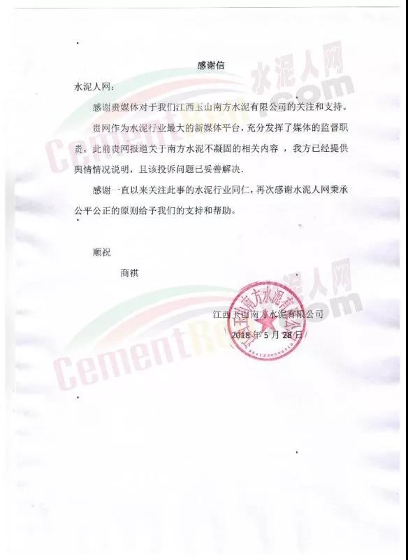 此前,湖南玉山水泥也發(fā)來《感謝信》稱,感謝水泥人網(wǎng)對于江西玉山南方水泥有限公司的關(guān)注和支持。水泥人網(wǎng)作為行業(yè)中最大的新媒體平臺,充分發(fā)揮了媒體的監(jiān)督職責(zé),此前水泥人網(wǎng)報道的關(guān)于南方水泥不凝固的相關(guān)內(nèi)容,江西玉山南方水泥已經(jīng)妥善解決。