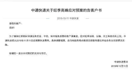 日前,中通快遞發(fā)布關(guān)于旺季高峰應(yīng)對預(yù)案的告客戶書稱為了確保旺季期間快遞服務(wù)安全、平穩(wěn),保持服務(wù)質(zhì)量和客戶滿意度,應(yīng)對旺季場地、運(yùn)輸 、用工等費(fèi)用的上漲,中通快遞將從11月11日起調(diào)整費(fèi)用。