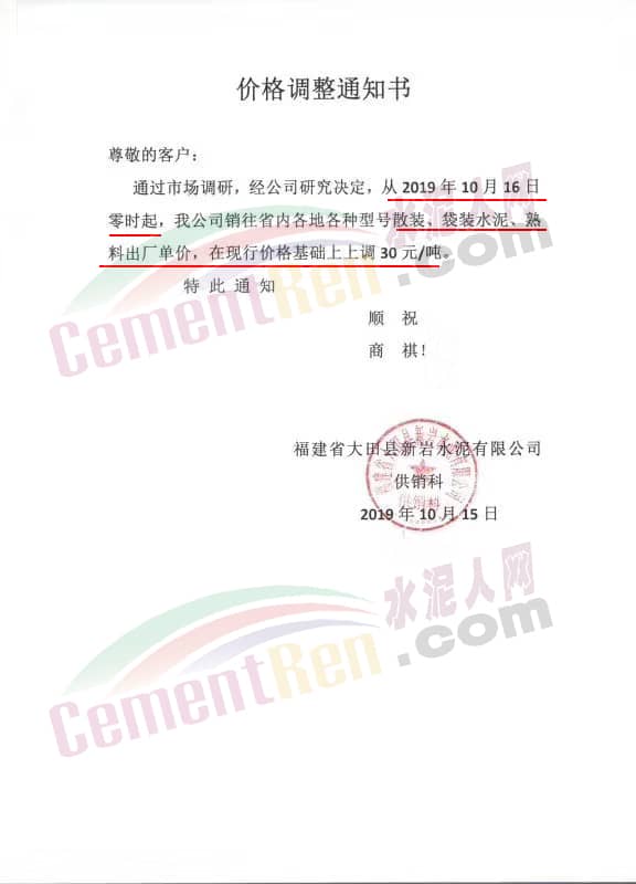 福建省大田縣新巖水泥有限公司供銷科價格調(diào)整通知書稱,從今日(16日)零時起,銷往省內(nèi)各地各種型號散裝、袋裝水泥、熟料出廠單價在現(xiàn)行基礎(chǔ)上上調(diào)30元/噸。