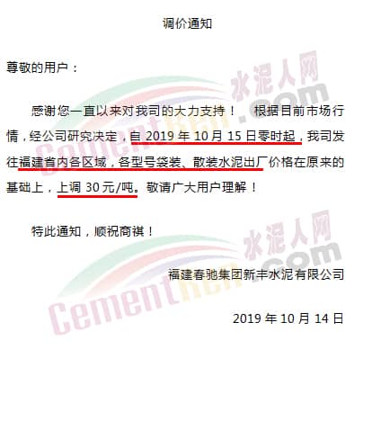 福建春馳集團(tuán)新豐水泥有限公司通知自15日零時起上調(diào)福建省內(nèi)各區(qū)域 ,各型號袋、散裝水泥出廠價格,上調(diào)