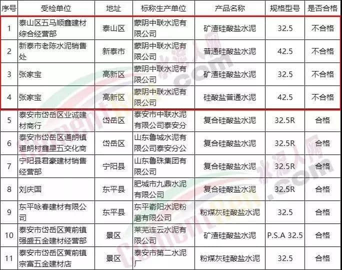 山東泰安4批次樣品不合格,抽樣合格率為63.6%據(jù)通報(bào),泰安市市場監(jiān)管局于2019年8月至10月在全市范圍內(nèi)組織開展了第一批流通領(lǐng)域水泥商品質(zhì)量監(jiān)督抽查。本次共監(jiān)督抽查10家經(jīng)營部,抽取11批次樣品。其中檢出4批次樣品不合格,本次水泥商品抽樣合格率為63.6%。4個(gè)批次不合格水泥基本情況:2批次礦渣硅酸鹽水泥和2批次普通硅酸鹽水泥;標(biāo)稱生產(chǎn)單位均為蒙陰中聯(lián)水泥有限公司;標(biāo)識(shí)生產(chǎn)單位地址均為山東省蒙陰縣蒙陰鎮(zhèn)東城村;包裝袋上標(biāo)注商標(biāo)均為蒙陰中聯(lián);不合格樣品的不合格項(xiàng)目主要有氯離子、燒失量、3天強(qiáng)度、28天強(qiáng)度等。經(jīng)營者分別是泰山區(qū)五馬順鑫建材綜合經(jīng)營部,新泰市老陳水泥銷售處,北集坡鎮(zhèn)張家寶。泰安市2019年度流通領(lǐng)域水泥商品質(zhì)量第一批專項(xiàng)監(jiān)督抽查結(jié)果總匯表