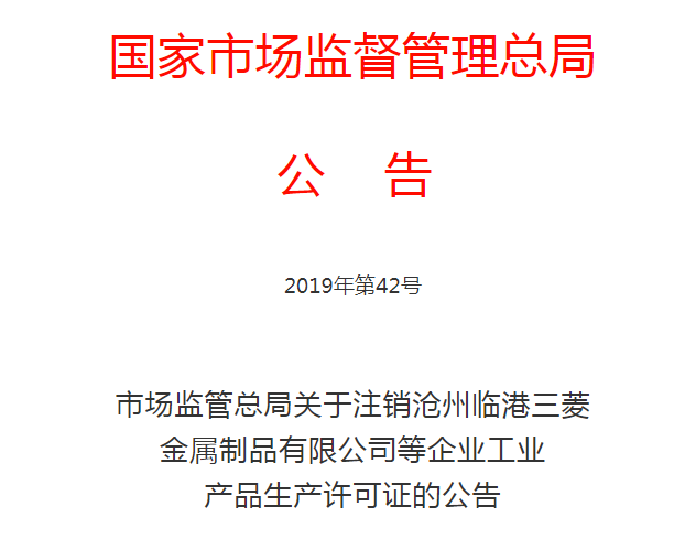 水泥人網(wǎng)消息:日前,國家市場監(jiān)管總局發(fā)布《關(guān)于注銷滄州臨港三菱金屬制品有限公司等企業(yè)工業(yè)產(chǎn)品生產(chǎn)許可證的公告》稱:根據(jù)《中華人民共和國工業(yè)產(chǎn)品生產(chǎn)許可證管理?xiàng)l例》(國務(wù)院令第440號)、《中華人民共和國工業(yè)產(chǎn)品生產(chǎn)許可證管理?xiàng)l例實(shí)施辦法》(質(zhì)檢總局令第156號),因生產(chǎn)許可證有效期屆滿未延續(xù)等情形,決定注銷滄州臨港三菱金屬制品有限公司等603家企業(yè)的工業(yè)產(chǎn)品生產(chǎn)許可證,并將名單予以公布。