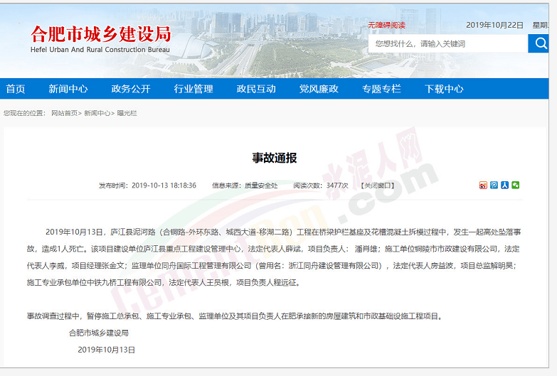 近日,安徽省合肥市城鄉(xiāng)建設(shè)局公布了一起事故通告,廬江縣發(fā)生一起高墜事故造成1人死亡。
