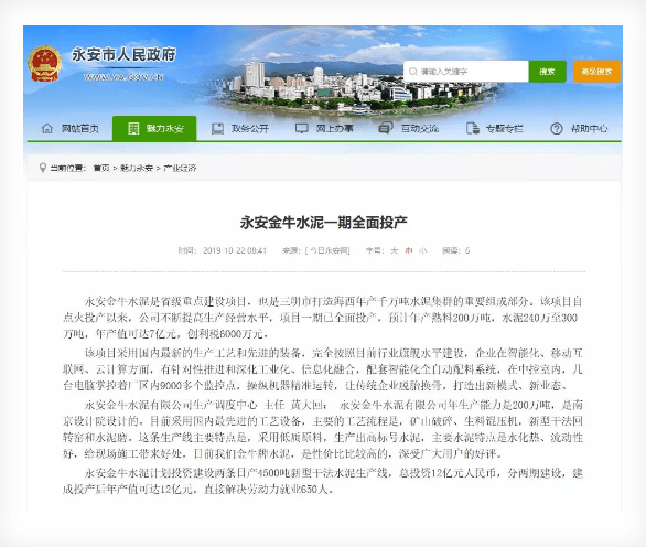 日前,永安市人民政府發(fā)布永安金牛水泥一期全面投產的消息。消息稱,永安金牛水泥是省級重點建設項目,也是三明市打造海西年產千萬噸水泥集群的重要組成部分。該項目自點火投產以來,公司不斷提高生產經營水平,項目一期已全面投產,預計年產熟料200萬噸,水泥240萬至300萬噸,年產值可達7億元,創(chuàng)利稅6000萬元。