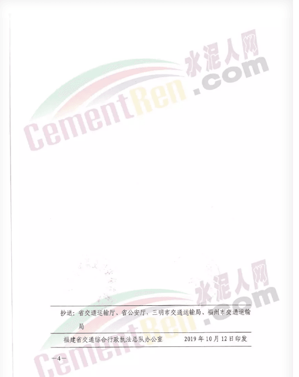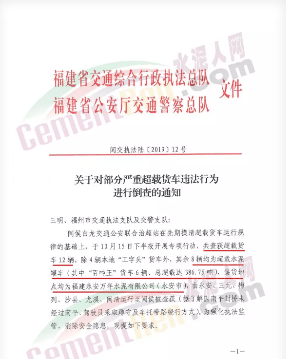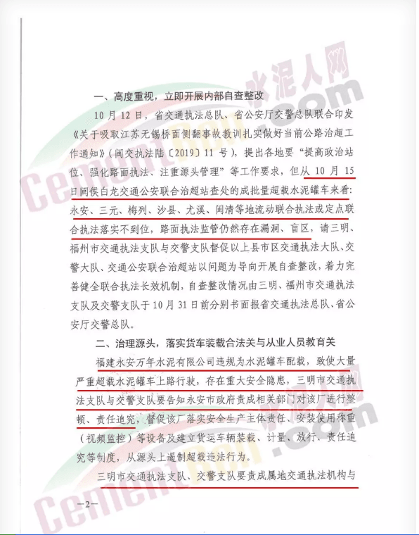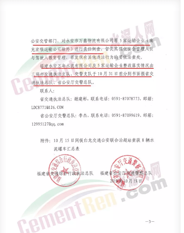 福建永安萬(wàn)年水泥有限公司及5家運(yùn)輸企業(yè)整改落實(shí)情況由三明市交通執(zhí)法支隊(duì)、交警支隊(duì)于10月31日前分別書(shū)面報(bào)省交通執(zhí)法總隊(duì)、省公安廳交警總隊(duì)。通知原文如下: