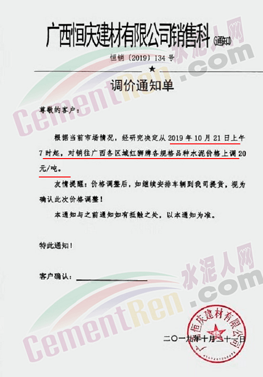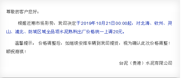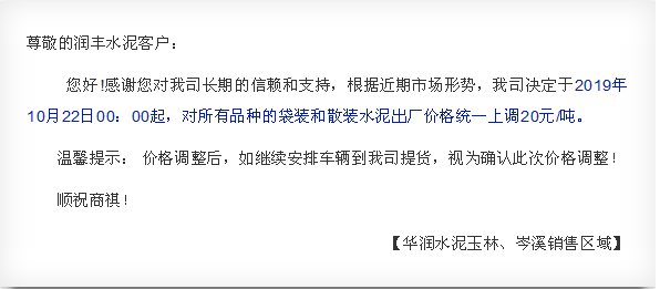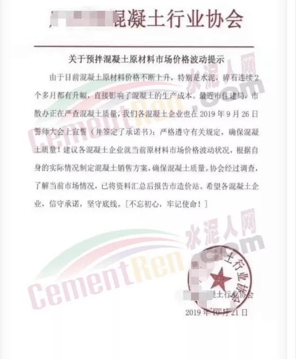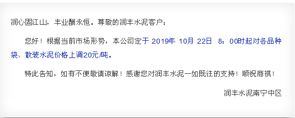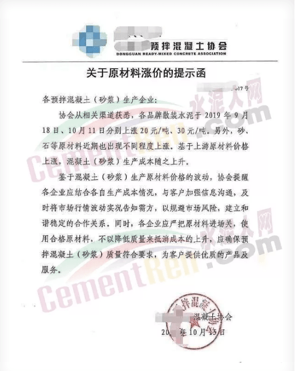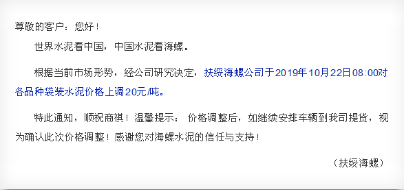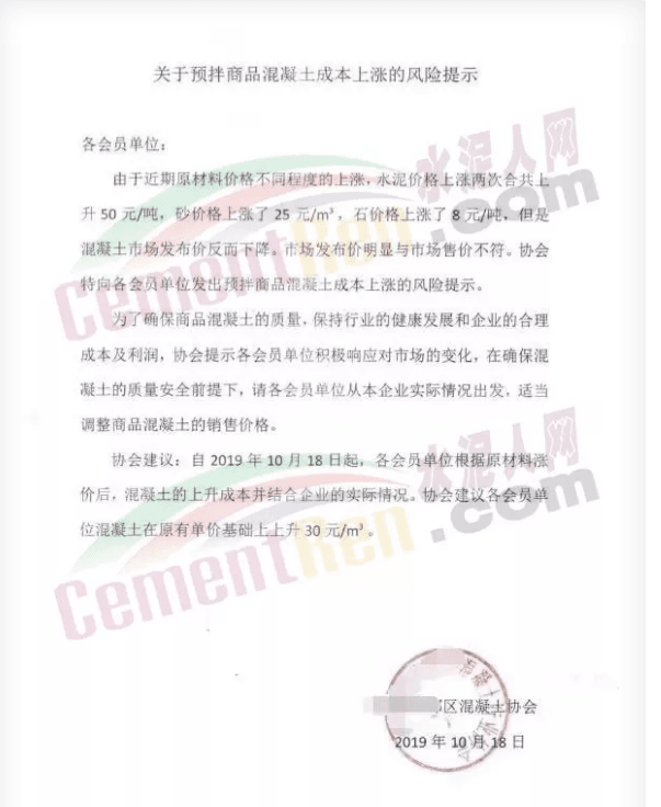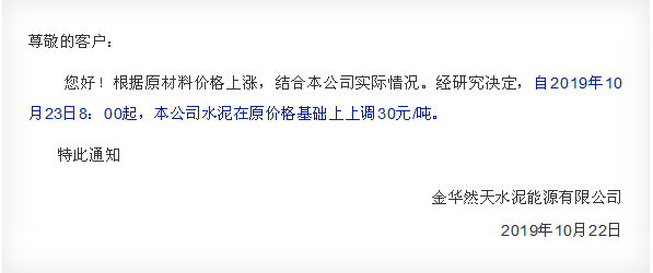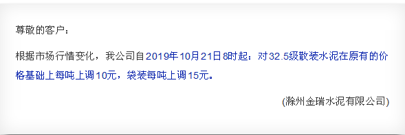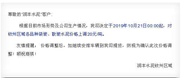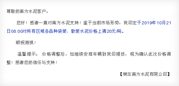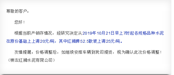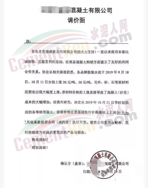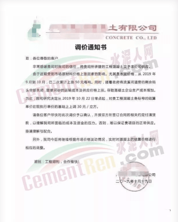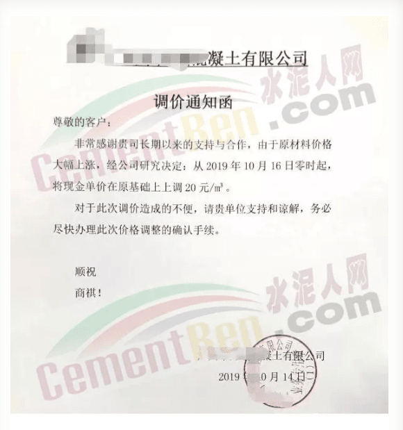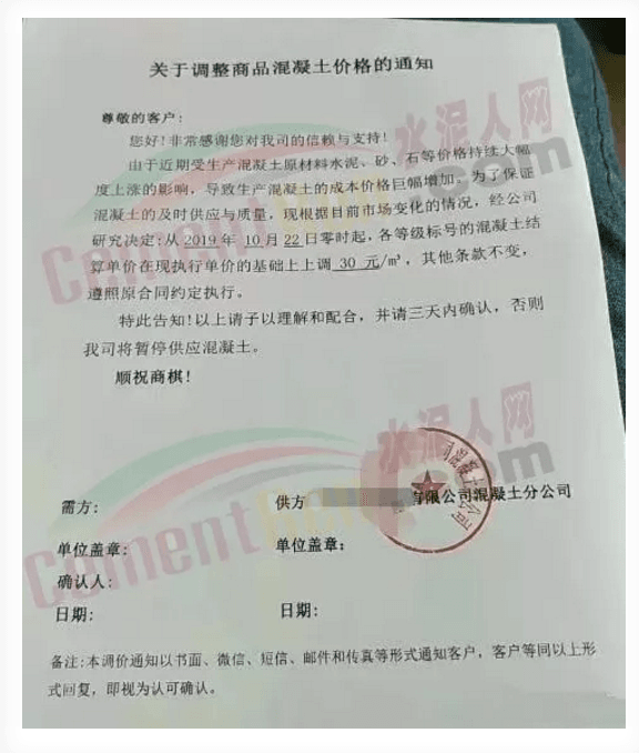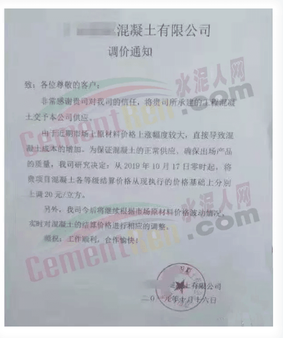 多家混凝土企業(yè)通知上調(diào)各標號混凝土價格,上調(diào)幅度30元/立方。其中一家混凝土公司調(diào)價通知書中提及,由于近期受到市場原材料價格上漲因素的影響,尤其是水泥價格,從2019年9月到10月,已二次累計上漲50元/噸。