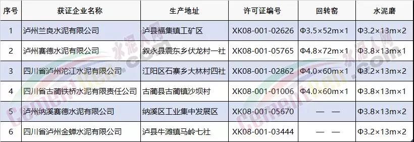 據(jù)查詢,市場監(jiān)管總局工業(yè)品生產(chǎn)許可證辦公室數(shù)據(jù)顯示四川省瀘州市6家已取得工業(yè)品生產(chǎn)許可證的水泥企業(yè)中瀘州蘭良水泥有限公司、瀘州賽德水泥有限公司、四川省瀘州沱江水泥有限公司、四川省古藺鐵橋水泥有限責(zé)任公司4家企業(yè)關(guān)鍵設(shè)備中包括熟料生產(chǎn)工序關(guān)鍵設(shè)備回轉(zhuǎn)窯及水泥生產(chǎn)工序關(guān)鍵設(shè)備水泥磨;而瀘州納溪賽德水泥有限公司和四川省瀘州金蟬水泥有限公司關(guān)鍵設(shè)備僅包括水泥磨。
