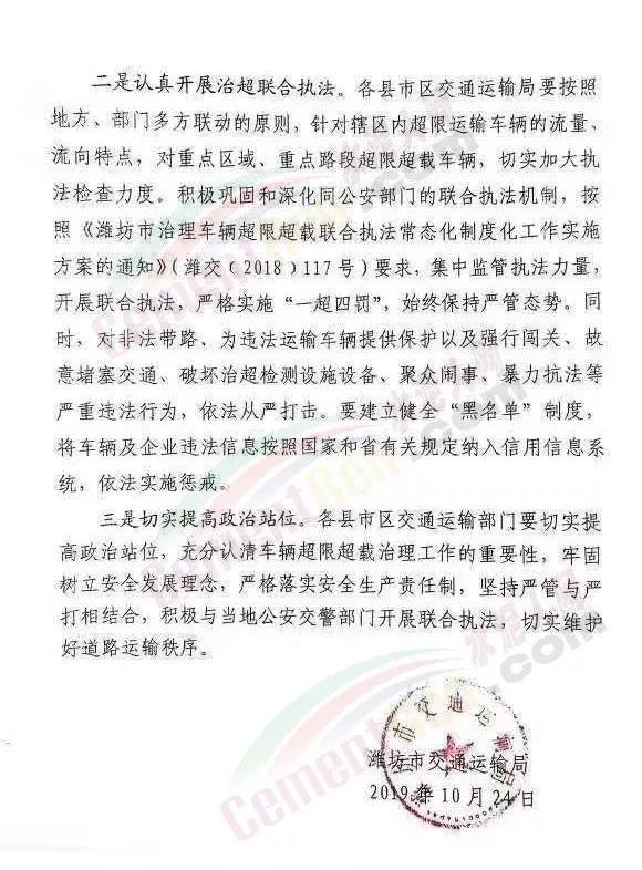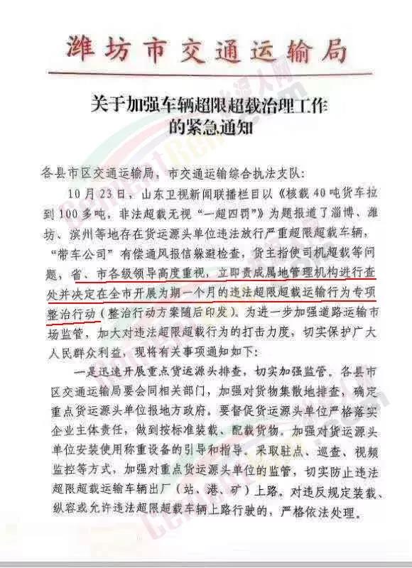 為進一步加強道路運輸市場監(jiān)管,加大對違法超限超載行為的打擊力度,切實保護廣大人民群眾利益,并將相關(guān)事項通知如下:一、迅速開展重點貨運源頭排查,切實加強監(jiān)管各縣市區(qū)交通運輸局要會同相關(guān)部門,加強對貨物集散地排查,確定重點貨運源頭單位報地方政府,要督促貨運源頭單位嚴(yán)格落實企業(yè)主體責(zé)任,做到按標(biāo)準(zhǔn)裝載、配載貨物。加強對貨運源頭單位安裝使用稱重設(shè)備和引導(dǎo)和指導(dǎo)。采取駐點、巡查、視頻、監(jiān)控等方式,加強對重點貨運源頭單位的監(jiān)管,切實防止違法超限超載運輸車輛出廠(站、港、礦)上路。對違反規(guī)定裝載、縱容或允許違法超限超載車輛上路行駛的,嚴(yán)格依法處理。二、認(rèn)真開展治超聯(lián)合執(zhí)法各縣市區(qū)交通運輸局要按照地方、部門多方聯(lián)動的原則,針對轄區(qū)內(nèi)超限運輸車輛的流量,流向特別,對重點區(qū)域 、重點路段超限超載車輛,切實加大執(zhí)法檢查力度。積極鞏固和深化同公安部門的聯(lián)合執(zhí)法機制,按照《濰坊市治理車輛超限超載聯(lián)合執(zhí)法常態(tài)化制度化工作實施方案的通知》(濰交【2018】117號)要求,集中監(jiān)管執(zhí)法力量,開展聯(lián)合執(zhí)法,嚴(yán)格實施“一超四罰”,始終保持嚴(yán)管態(tài)勢。同時,對非法帶路,為違法運輸車輛提供保護以及強行闖關(guān)、故意堵塞交通、破壞治超檢測設(shè)施設(shè)備、聚眾門事、暴力抗法等嚴(yán)重違法行為,依法從嚴(yán)打擊。要建立健全“黑名單”制度,將車輛及企業(yè)違法信息按照國家和省有關(guān)規(guī)定納入信用信息系統(tǒng),依法實施懲戒。三、切實提高政治站位各縣市區(qū)交通運輸部門要切實提高政治站位,充分認(rèn)清車國內(nèi)超限超載治理工作的重要性,牢固樹立安全發(fā)展理念,嚴(yán)格落實安全生產(chǎn)責(zé)任制,堅持嚴(yán)管與嚴(yán)打相結(jié)合 ,積極與當(dāng)?shù)毓步痪块T開展聯(lián)合執(zhí)法,切實維護好道路運輸秩序。通知原文如下: