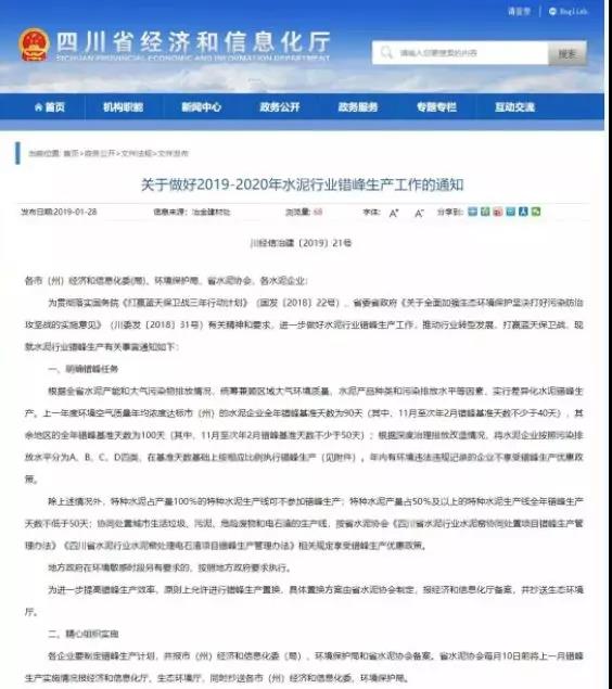 今年1月初,四川省四川省工業(yè)和信息化廳與四川省生態(tài)環(huán)境廳聯(lián)合發(fā)布《關(guān)于做好2019-2020年水泥行業(yè)錯(cuò)峰生產(chǎn)的通知》要求上一年度環(huán)境空氣質(zhì)量年均濃度達(dá)標(biāo)市(州)的水泥企業(yè)全年錯(cuò)峰基準(zhǔn)天數(shù)為90天(其中,11月至次年2月錯(cuò)峰基準(zhǔn)天數(shù)不少于40天),其余地區(qū)的全年錯(cuò)峰基準(zhǔn)天數(shù)為100天(其中,11月至次年2月錯(cuò)峰基準(zhǔn)天數(shù)不少于50天);除上述情況外,特種水泥占產(chǎn)量100%的特種水泥生產(chǎn)線可不參加錯(cuò)峰生產(chǎn);特種水泥產(chǎn)量占50%及以上的特種水泥生產(chǎn)線全年錯(cuò)峰生產(chǎn)天數(shù)不低于50天;協(xié)同處置城市生活垃圾、污泥、危險(xiǎn)廢物和電石渣的生產(chǎn)線,按四川省水泥協(xié)會(huì)相關(guān)管理辦法規(guī)定享受錯(cuò)峰生產(chǎn)優(yōu)惠政策。