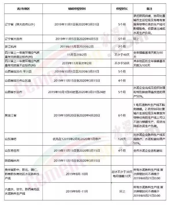9月26日臨汾市人民政府辦公室印發(fā)臨汾市2019-2020年秋冬季工業(yè)企業(yè)錯(cuò)峰生產(chǎn)管控方案要求轄區(qū)平川縣(市、區(qū))從2019年10月1日—2020年3月31日;山區(qū)縣從2019年11月15日—2020年3月15日期間水泥生產(chǎn)等工業(yè)企業(yè)錯(cuò)峰生產(chǎn)。