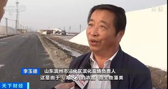 山東省濱州市沾化區(qū)濱化鹽場負(fù)責(zé)人 李玉德:由于海水的濃度、微生物藻類、光線強(qiáng)弱、水的深度,比如有的是20公分,有的是50公分,深度不一樣,所以從上面看起來,顏色也會有一定變化。