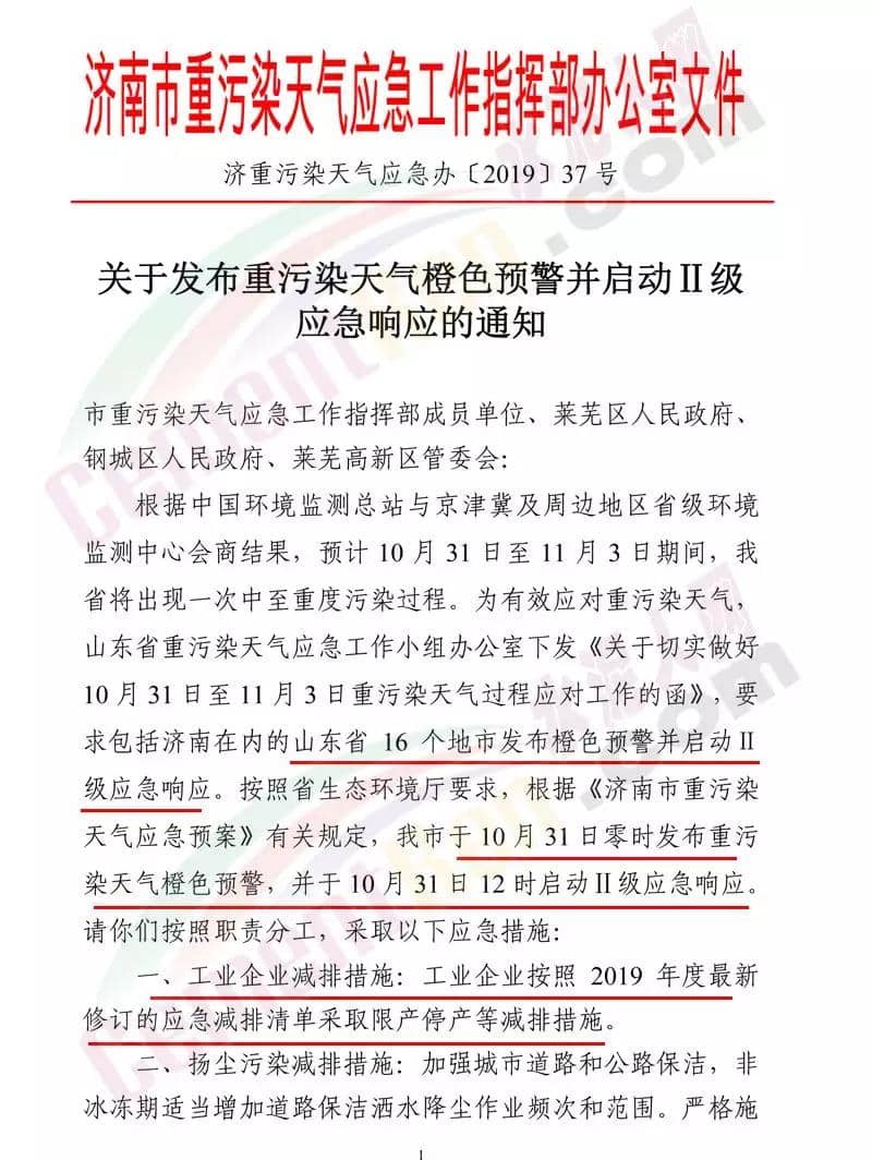 山東省16個(gè)地市發(fā)布橙色預(yù)警并啟動(dòng)II級(jí)應(yīng)急響應(yīng),其中濟(jì)南市于10月31日12時(shí)啟動(dòng)II級(jí)應(yīng)急響 應(yīng)。工業(yè)企業(yè)按照2019年度最新修訂的應(yīng)急減排 清單采取限產(chǎn)停產(chǎn)等減排措施。