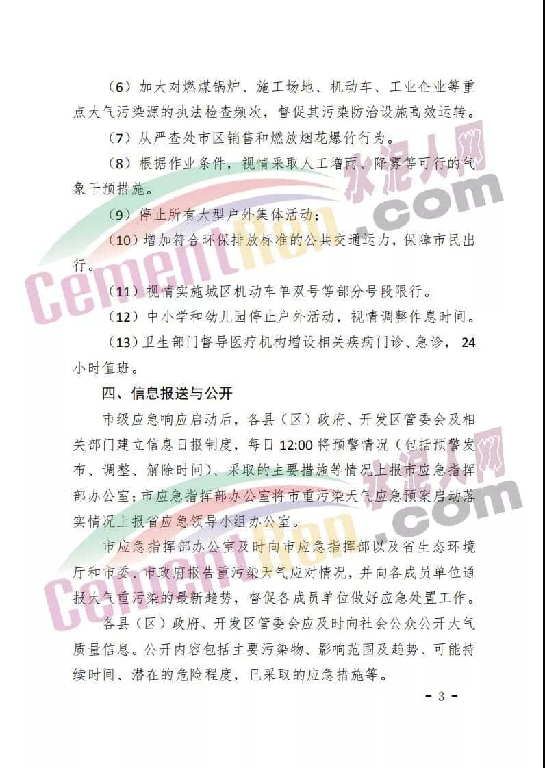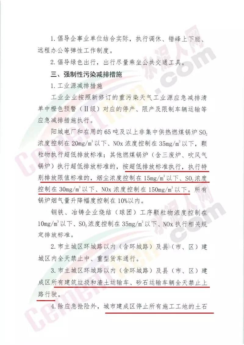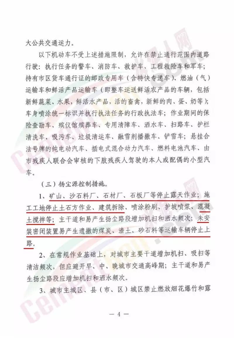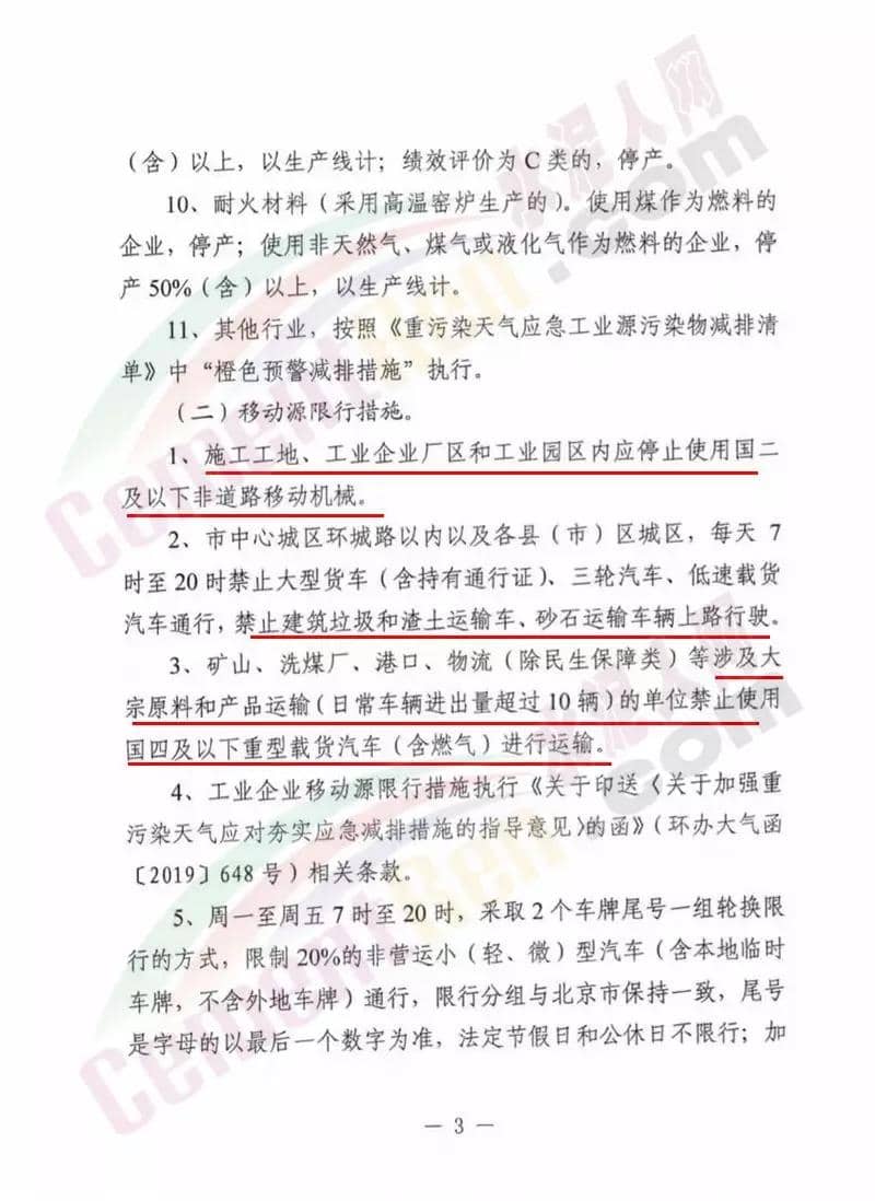 全面落實(shí)應(yīng)急響應(yīng)減排措施工業(yè)源停限產(chǎn)措施。水泥行業(yè)(特種水泥行業(yè)除外)。水泥制品、粉磨站停產(chǎn);水泥熟料生產(chǎn)線停產(chǎn);協(xié)同處置城市生活垃圾或危險(xiǎn)廢物的企業(yè),日處理生活垃圾與污泥總量低于400噸(含)、處理有毒有害廢棄物總量低于熟料產(chǎn)能4%(含)的生產(chǎn)線,停產(chǎn)。移動(dòng)源限行措施。1、施工工地、工業(yè)企業(yè)廠區(qū)和工業(yè)園區(qū)內(nèi)應(yīng)停止使用國二及以下非道路移動(dòng)機(jī)械。2、市中心城區(qū)環(huán)城路以內(nèi)以及各縣(市)區(qū)城區(qū),每天7時(shí)至20時(shí)禁止大型貨車(含持有通行證)、三輪汽車、低速載貨汽車通行,禁止建筑垃圾和渣土運(yùn)輸車、砂石運(yùn)輸車輛上路行駛。3、礦山、洗煤廠、港口、物流(除民生保障類)等涉及大宗原料和產(chǎn)品運(yùn)輸(日常車輛進(jìn)出量超過10輛)的單位禁止使用國四及以下重型載貨汽車(含燃?xì)?進(jìn)行運(yùn)輸。4、工業(yè)企業(yè)移動(dòng)源限行措施執(zhí)行《關(guān)于印送〈關(guān)于加強(qiáng)重污染天氣應(yīng)對(duì)夯實(shí)應(yīng)急減排措施的指導(dǎo)意見〉的函》(環(huán)辦大氣函〔2019〕648號(hào))相關(guān)條款。揚(yáng)塵源控制措施。礦山、沙石料廠、石材廠、石板廠等停止露天作業(yè);施工工地停止土石方作業(yè)、建筑拆除、噴涂粉刷、護(hù)坡噴漿、混凝土攪拌等;主干道和易產(chǎn)生揚(yáng)塵路段增加機(jī)掃和灑水頻次;未安裝密閉裝置易產(chǎn)生遺撒的煤炭、渣土、砂石料等運(yùn)輸車輛停止上路。通知原文如下:
