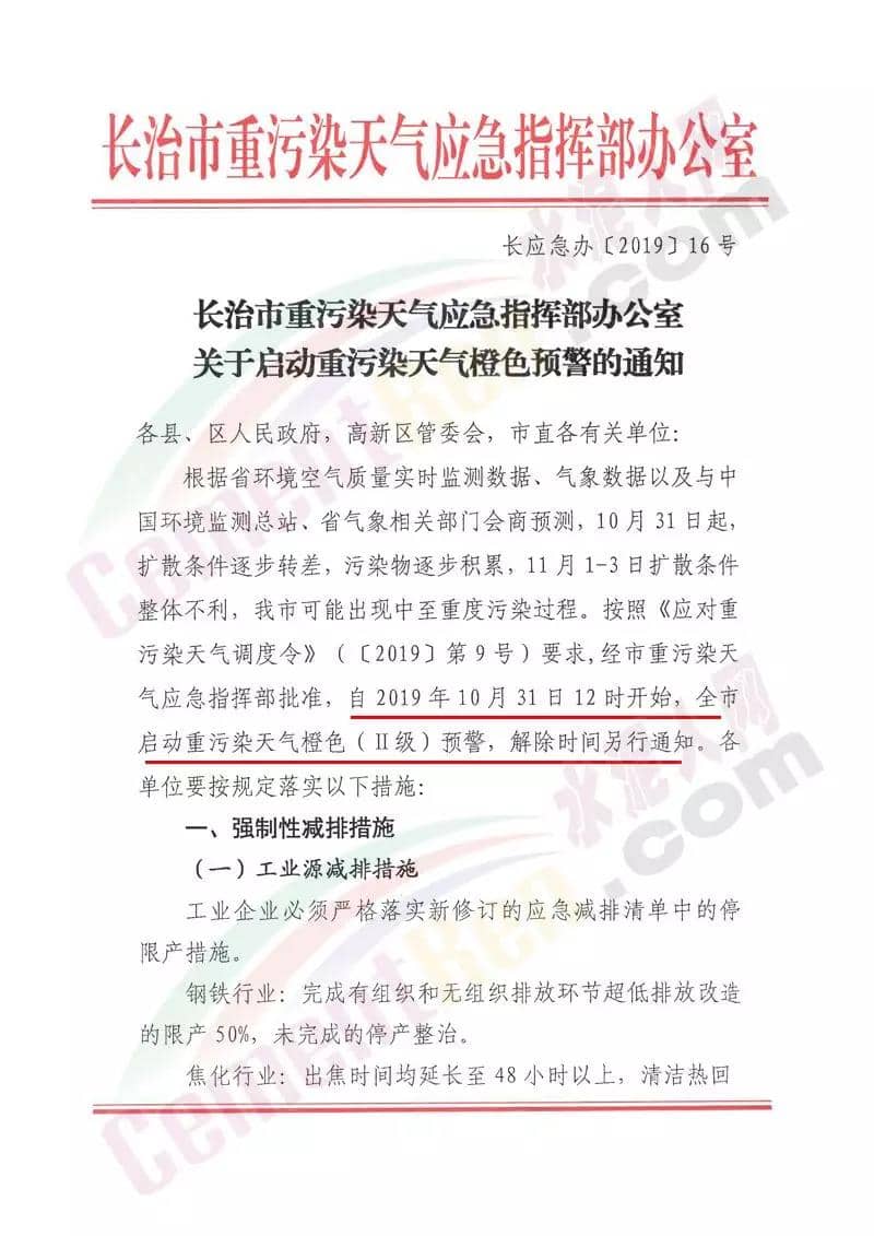 山西長(zhǎng)治市重污染天氣應(yīng)急指揮部辦公室發(fā)布《發(fā)于啟動(dòng)重污染天氣橙色預(yù)警的通知》稱,將從今日中午12時(shí)開始啟動(dòng)重污染天氣橙色(II級(jí))預(yù)警,解除時(shí)間另行通知。