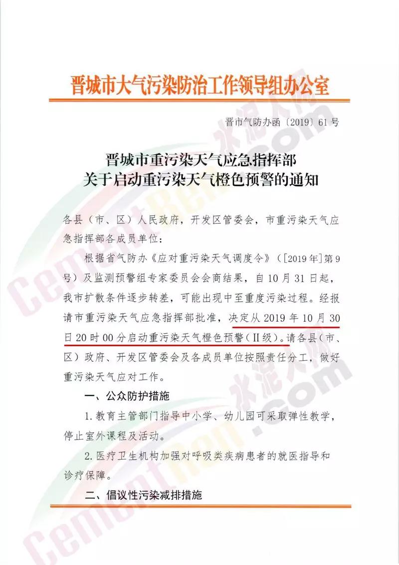 晉城市大氣污染防治工作領(lǐng)導(dǎo)組辦公室發(fā)布《晉城市重污染天氣應(yīng)急指揮部關(guān)于啟動(dòng)重污染天氣橙色預(yù)警的通知》稱:從10月30日20時(shí)啟動(dòng)重污染天氣橙色預(yù)警(II級(jí))。