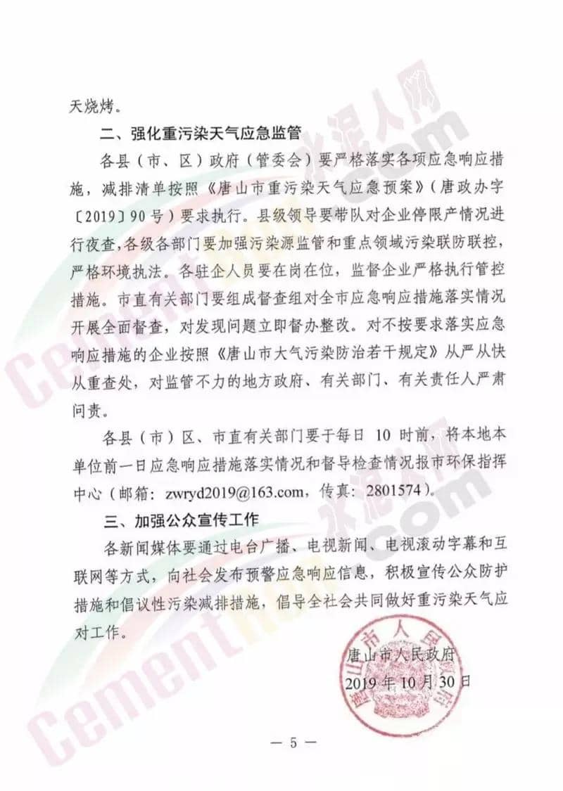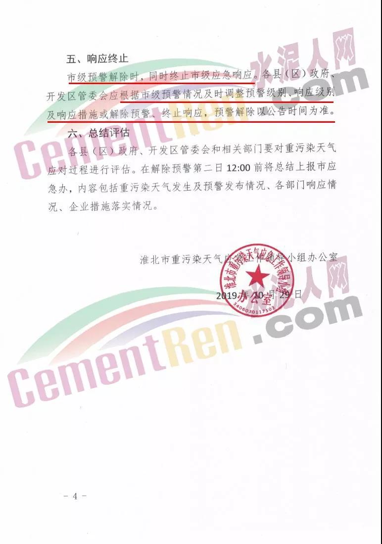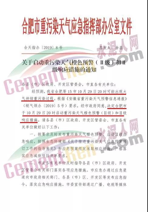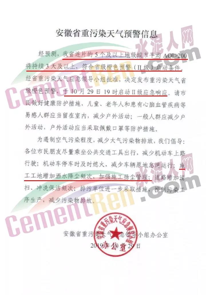 按照《安徽省重污染天氣預(yù)警信息通報(bào)》(皖氣領(lǐng)辦〔2019〕5號(hào))要求,決定發(fā)布重污染天氣橙色預(yù)警,并于10月29日20時(shí)啟動(dòng)Ⅱ級(jí)應(yīng)急響應(yīng)。對(duì)水泥企業(yè)采取限時(shí)停產(chǎn)、限排、限制運(yùn)輸?shù)却胧?/p>