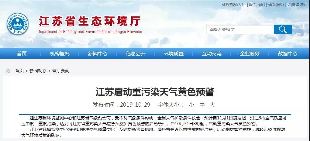 10月29日江蘇省生態(tài)環(huán)境廳也發(fā)布了預(yù)警信息:沿江八市31日起啟動(dòng)重污染天氣黃色預(yù)警。據(jù)了解,預(yù)計(jì)自11月1日凌晨起,江蘇省沿江8市空氣質(zhì)量可達(dá)中度-重度污染,達(dá)到《江蘇省重污染天氣應(yīng)急預(yù)案》黃色預(yù)警的啟動(dòng)條件。