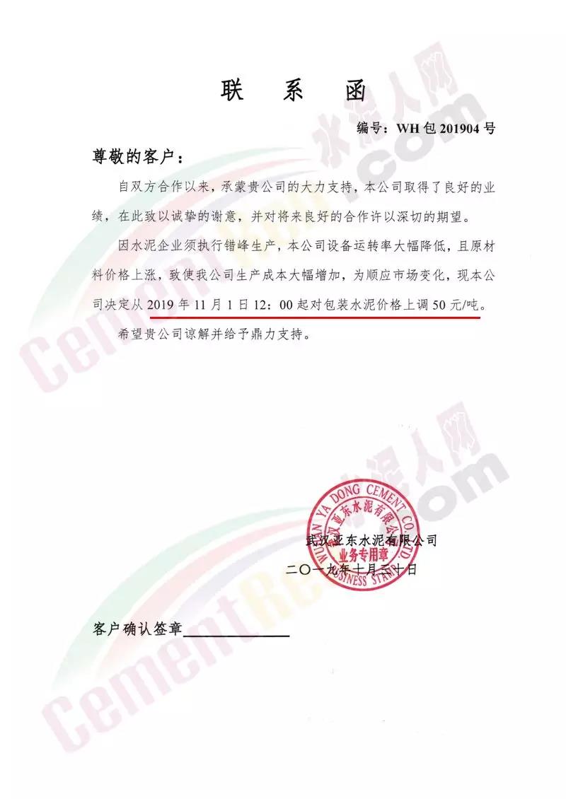 日前,湖北區(qū)域主導(dǎo)企業(yè)華新水泥、亞?wèn)|水泥等發(fā)布調(diào)價(jià)通知稱上調(diào)水泥價(jià)格,最高漲60元/噸。其中亞?wèn)|水泥調(diào)價(jià)通知稱,因水泥企業(yè)執(zhí)行錯(cuò)峰生產(chǎn),公司設(shè)備運(yùn)轉(zhuǎn)率大幅降低,且原材料價(jià)格上漲,致使公司生產(chǎn)成本大幅增加,為順應(yīng)市場(chǎng)變化 ,決定 自11月1日12時(shí)起對(duì)散裝水泥上調(diào)60元/噸,包裝水泥上調(diào)50元/噸。調(diào)價(jià)通知如下: