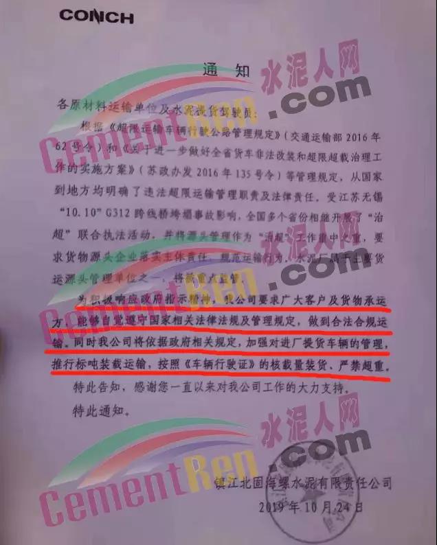 海螺水泥向超載開刀 同時(shí)鎮(zhèn)江北固海螺水泥發(fā)布通知稱:為積極響應(yīng)政府指示精神,鎮(zhèn)江北固海螺水泥要求廣大客戶及貨物承運(yùn)方,能夠自覺(jué)遵守國(guó)家相關(guān)法律法規(guī)及管理規(guī)定,做到合法合規(guī)運(yùn)輸。同時(shí),鎮(zhèn)江北固海螺水泥將依據(jù)政府相關(guān)規(guī)定,加強(qiáng)對(duì)進(jìn)廠提貨車輛的管理,推行標(biāo)噸裝載運(yùn)輸,按照《車輛行駛證》的核載量裝貨,嚴(yán)禁超重。