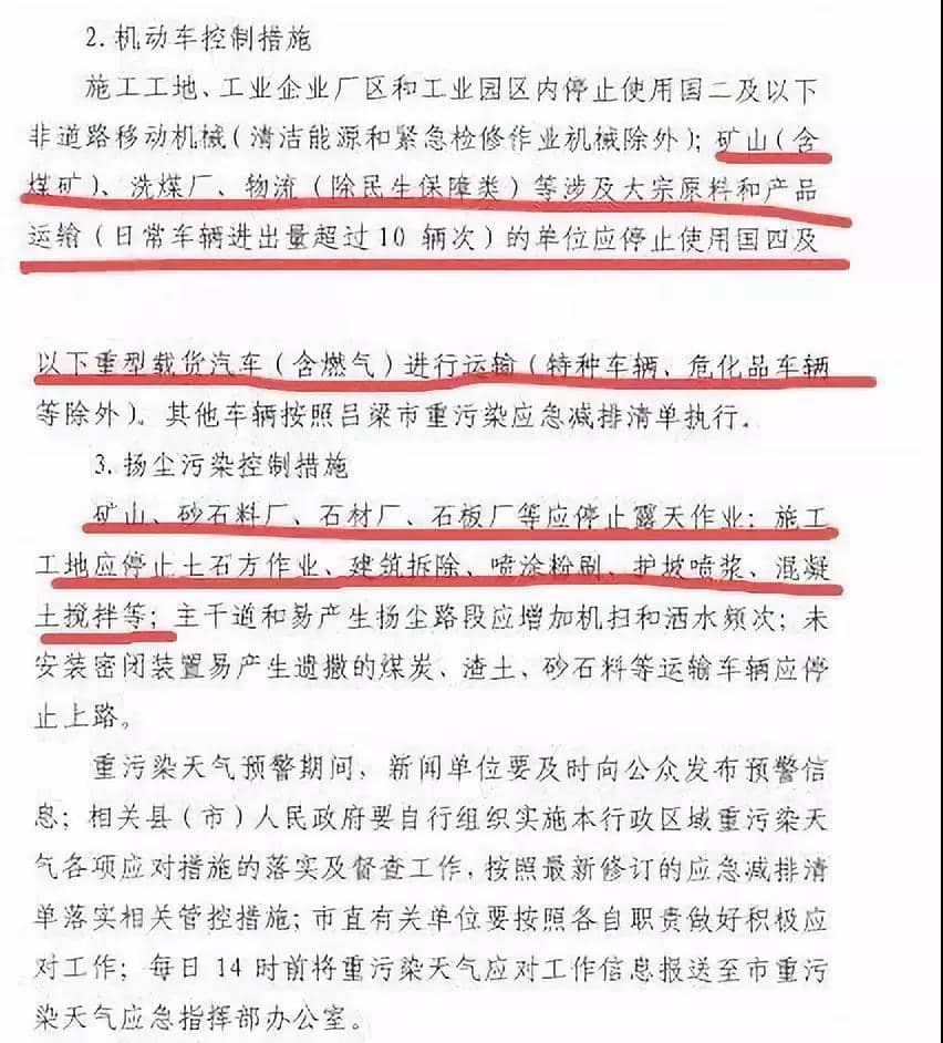 在保障城市正常運(yùn)行的前提下:(一)工業(yè)企業(yè)減排措施。工業(yè)企業(yè)按“工業(yè)源減排清單”執(zhí)行橙色預(yù)警減排措施,縣(市、區(qū))政府、各有關(guān)部門和應(yīng)急減排督導(dǎo)檢查組加強(qiáng)對(duì)橙色預(yù)警管控企業(yè)及供熱站、電力生產(chǎn)和供應(yīng)等保障類企業(yè)督導(dǎo)檢查,確保減排措施執(zhí)行到位。(二)移動(dòng)源減排措施。1、施工工地、工業(yè)企業(yè)廠區(qū)及工業(yè)園內(nèi)停止使用國(guó)二及以下非道路移動(dòng)機(jī)械(清潔能源和緊急搶修作業(yè)機(jī)械除外)。2、礦山(含煤礦)、洗煤廠、物流(除民生保障類)等涉及大宗物料運(yùn)輸(日常車輛進(jìn)出超過10輛次)的單位停止使用國(guó)四及以下重型載貨車(含燃?xì)?進(jìn)行運(yùn)輸(特種車輛、?;奋囕v等除外)。3、有色、電力、化工、煤炭、玻璃等重點(diǎn)行業(yè)涉及大宗物料運(yùn)輸?shù)钠髽I(yè)按照“工業(yè)源減排清單”中橙色預(yù)警車輛運(yùn)輸減排要求執(zhí)行。4、在高速環(huán)內(nèi)實(shí)行交通管控,除運(yùn)輸瓜果蔬菜等新鮮農(nóng)產(chǎn)品車輛及清障、環(huán)衛(wèi)、園林、道路養(yǎng)護(hù)等專項(xiàng)作業(yè)車輛除外,禁止中重型載貨車通行。5、公安交警部門嚴(yán)格車輛管控,對(duì)進(jìn)入建成區(qū)黃標(biāo)車、冒黑煙車進(jìn)行查扣處罰,對(duì)重型柴油貨車和散裝物料運(yùn)輸車要嚴(yán)格實(shí)行道路繞行。(三)揚(yáng)塵源和揮發(fā)性減排措施。1、除應(yīng)急搶險(xiǎn)外,市區(qū)所有房屋建筑、拆遷、市政、道路、水利、綠化、通訊等施工工地停止土石方作業(yè)、建筑拆除、護(hù)坡噴漿、混凝土攪拌以及露天切割、打磨、噴涂、粉刷等全部停止作業(yè)。2、渣土運(yùn)輸車輛、混凝土罐車、砂石運(yùn)輸車禁止通行(生活垃圾運(yùn)輸車輛除外)。省、市重點(diǎn)工程及地鐵工地經(jīng)市政府批準(zhǔn)后,可正常施工。3、礦山(除政府協(xié)調(diào)確定的應(yīng)急保障類企業(yè)外)、砂石料廠、石材廠、石板廠等停止露天作業(yè)。4、城市主干道路和易產(chǎn)生揚(yáng)塵路段應(yīng)增加機(jī)掃和灑水頻次。
