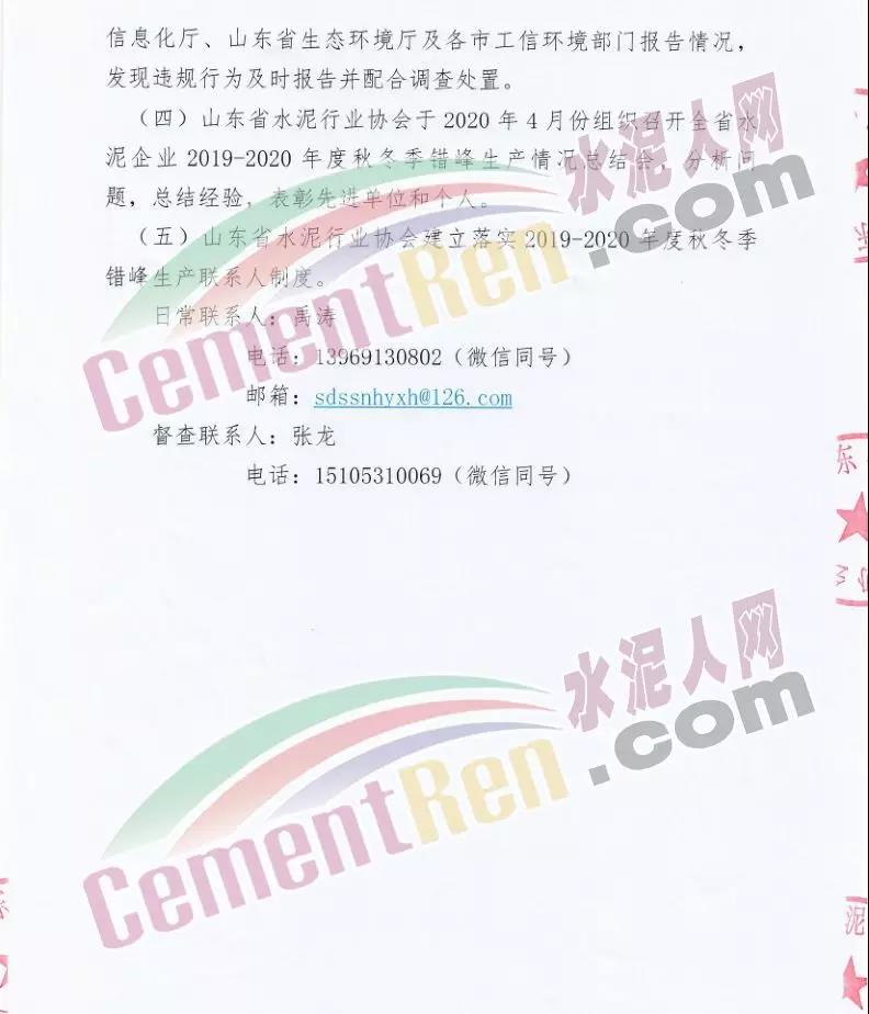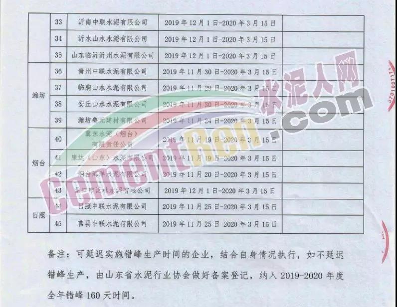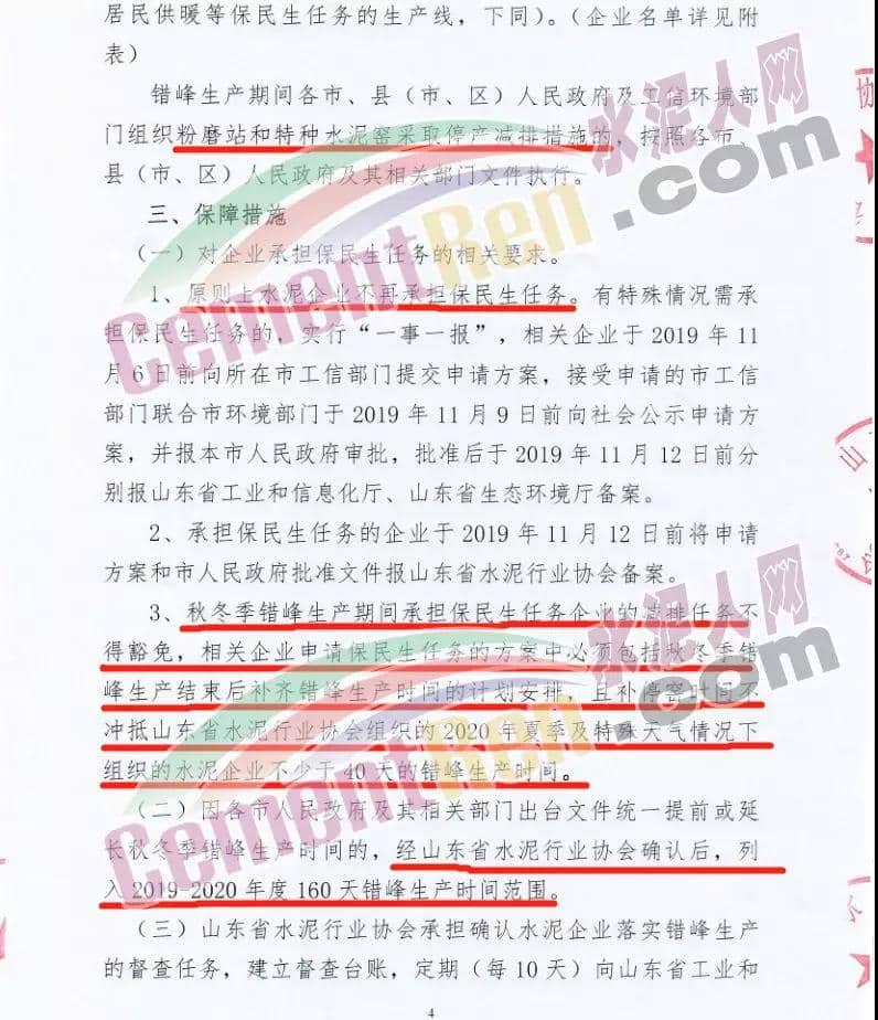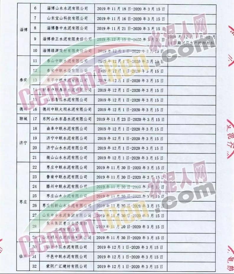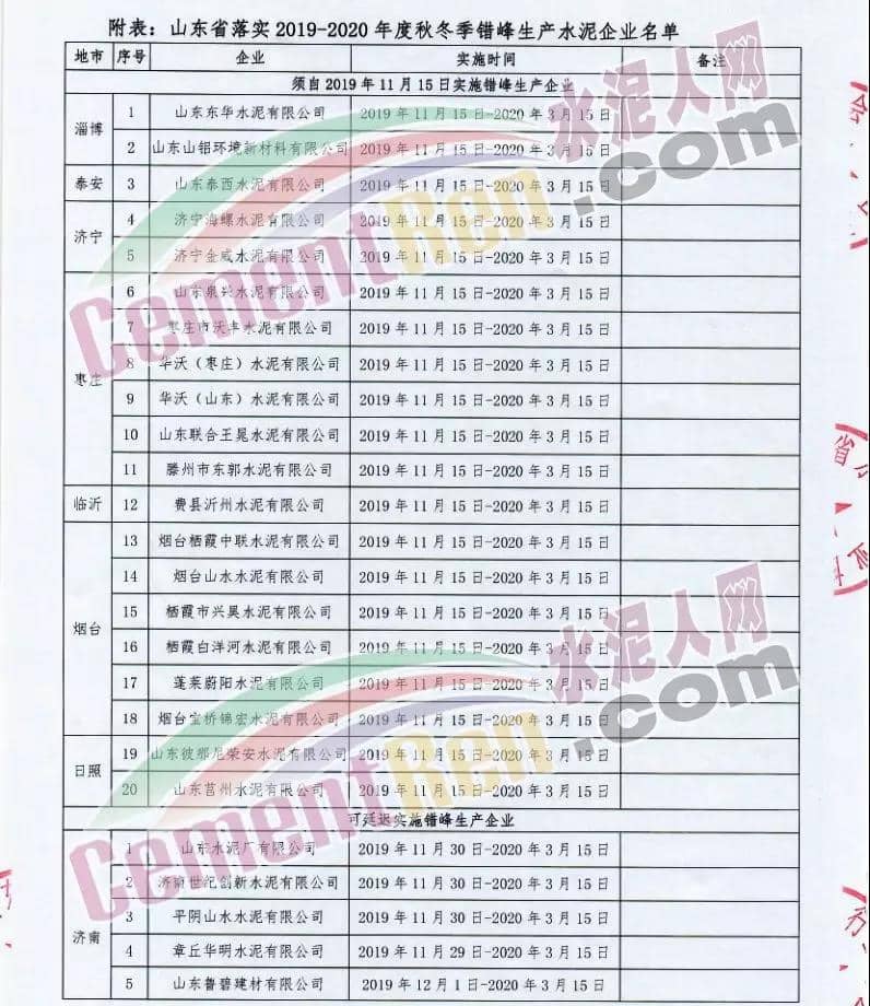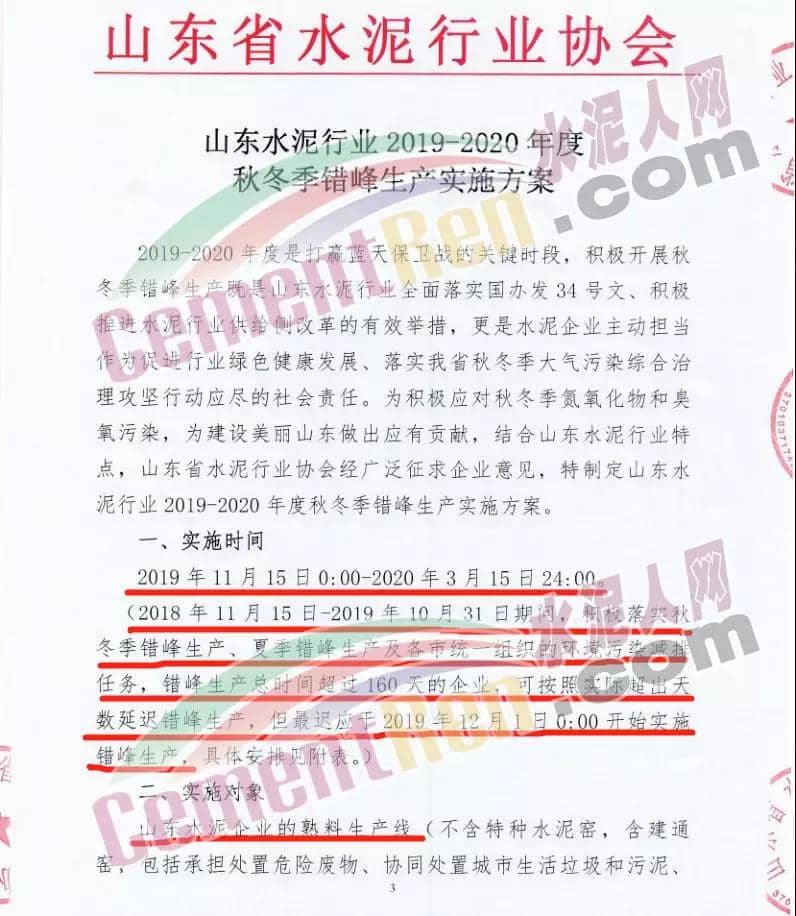 一、實(shí)施時(shí)間: 2019年11月15日0時(shí)-2020年3月15日24時(shí)。(2018年11月15日-2019年10月31日期間,積極落實(shí)秋冬季錯(cuò)峰生產(chǎn)、夏季錯(cuò)峰生及各市統(tǒng)一組織的環(huán)境污染減排任務(wù),錯(cuò)峰生產(chǎn)總時(shí)間超過(guò)160天的企業(yè),可按照實(shí)際超出天數(shù)延遲錯(cuò)峰生產(chǎn),但最遲應(yīng)于2019年12月1日0時(shí)開(kāi)始實(shí)施錯(cuò)峰生產(chǎn),具體安排見(jiàn)附表。)二、實(shí)施對(duì)象: 山東水泥企業(yè)的熟料生產(chǎn)線(不含特種水泥窯,含建通窯,包括承擔(dān)處置危險(xiǎn)廢物、協(xié)同處置城市生活垃圾和污泥、居民供暖等保民生任務(wù)的生產(chǎn)線,下同)。(企業(yè)名單見(jiàn)附表); 錯(cuò)峰生產(chǎn)期間各市、縣(市、區(qū))人民政府及工信環(huán)境部門組織粉磨站和特種水泥窯采取停產(chǎn)減排措施的,按照各市、縣(市、區(qū))人民政府及相關(guān)部門文件執(zhí)行。三、保障措施 1、原則上水泥企業(yè)不再承擔(dān)保民生任務(wù)。有特殊情況需承擔(dān)民生任務(wù)的,實(shí)行“一事一報(bào)”,相關(guān)企業(yè)于2019年11月6日前向所在市工信部門提交申請(qǐng)方案,接受申請(qǐng)的市工信部門聯(lián)合市環(huán)境部門于2019年11月9日前向社會(huì)公示申請(qǐng)方案,并報(bào)本市人民政府審批,批準(zhǔn)后于2019年11月12日前分別報(bào)山東省工業(yè)和信息化廳、山東省生態(tài)環(huán)境廳備案?! ?、承擔(dān)保民生任務(wù)的企業(yè)于2019年11月12日前將申請(qǐng)方案和市人民政府批準(zhǔn)文件報(bào)山東省水泥行業(yè)協(xié)會(huì)備案?! ?、秋冬季錯(cuò)峰生產(chǎn)期間承擔(dān)保民生任務(wù)企業(yè)的減排任務(wù)不得豁免,相關(guān)企業(yè)申請(qǐng)保民生任務(wù)的方案中必須包括秋冬季錯(cuò)峰生產(chǎn)結(jié)束后補(bǔ)齊錯(cuò)峰生產(chǎn)時(shí)間的計(jì)劃安排,且補(bǔ)停窯時(shí)間不沖抵山東省水泥行業(yè)協(xié)會(huì)組織的2020年夏季及特殊天氣情況下組織的水泥企業(yè)不少于40天的錯(cuò)峰生產(chǎn)時(shí)間。全文如下: