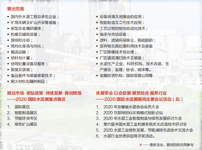 Cementtech(水泥展)作為行業(yè)內(nèi)影響力最大的專業(yè)展,展出面積超過20000平方米,為國際水泥相關(guān)設(shè)備制造商和服務(wù)供應(yīng)商提供客戶開發(fā)、渠道拓展和品牌宣傳維護等專業(yè)服務(wù);憑借十余年的專業(yè)經(jīng)驗,水泥展已成為行業(yè)內(nèi)最具影響力和號召力的服務(wù)貿(mào)易平臺!