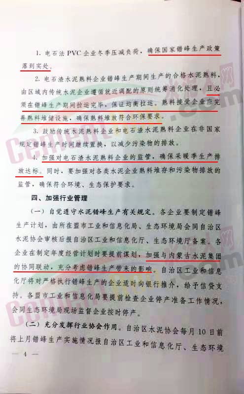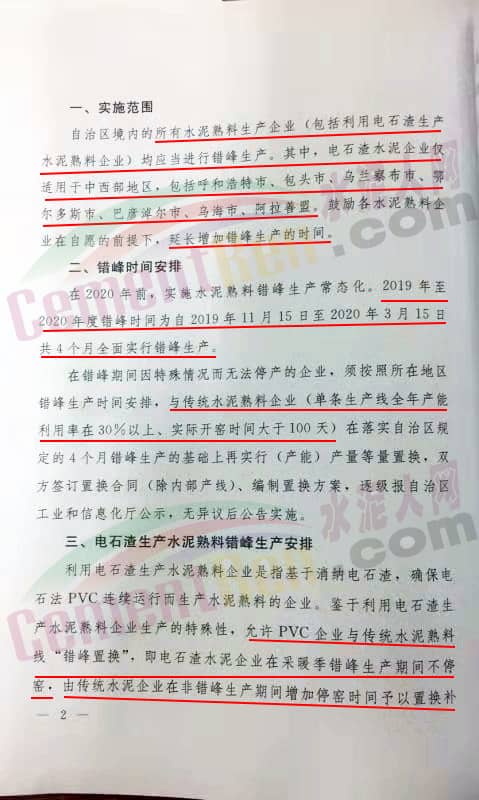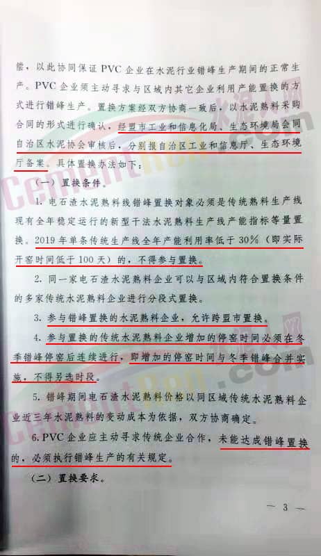 一、實(shí)施范圍 自治區(qū)境內(nèi)的所有水泥熟料生產(chǎn)企業(yè)(包括利用電石渣生產(chǎn)水泥熟料企業(yè))均應(yīng)當(dāng)進(jìn)行錯(cuò)峰生產(chǎn)。其中電石渣水泥企業(yè)僅適用于中西部地區(qū),包括呼和浩特市、包頭市、 烏蘭察布市、鄂爾多斯市、巴彥淖爾市、烏海市、阿拉善盟7個(gè)地區(qū),鼓勵(lì)個(gè)水泥熟料企業(yè)在自愿的前提下,延長增加錯(cuò)峰生產(chǎn)時(shí)間。 二、錯(cuò)峰時(shí)間安排 2019年至2020年度錯(cuò)峰時(shí)間為自2019年11月15日至2020年3月15日共4個(gè)月全面實(shí)行錯(cuò)峰生產(chǎn)。 在錯(cuò)峰期間因特殊情況而無法停業(yè)的企業(yè),必須按照所在地區(qū)錯(cuò)峰時(shí)間安排,與傳統(tǒng)水泥熟料企業(yè)(單條生產(chǎn)線全年產(chǎn)能利用率在30%以上,以實(shí)際開窯時(shí)間大于100天)在落實(shí)自治區(qū)規(guī)定的4個(gè)月錯(cuò)峰生產(chǎn)的基礎(chǔ)上再實(shí)行(產(chǎn)能)產(chǎn)量等量置換?! ∪?、電石渣生產(chǎn)水泥熟料錯(cuò)峰生產(chǎn)安排 確保電石法PVC連續(xù)運(yùn)行而生產(chǎn)水泥熟料企業(yè),鑒于利用電石渣生產(chǎn)水泥熟料企業(yè)生產(chǎn)的特殊性,允許PVC企業(yè)與傳統(tǒng)企業(yè)熟料線“錯(cuò)峰置換”,即電石渣水泥企業(yè)在采暖季錯(cuò)峰生產(chǎn)期間不停窯,由傳統(tǒng)企業(yè)在非錯(cuò)峰生產(chǎn)期間增加停窯時(shí)間予以置換補(bǔ)償。經(jīng)過盟市工業(yè)和信息化局、生態(tài)環(huán)境局同自治區(qū)水泥協(xié)會(huì)審核后,分別報(bào)自治區(qū)工業(yè)和信息廳、生態(tài)環(huán)境廳備案。具體如下: