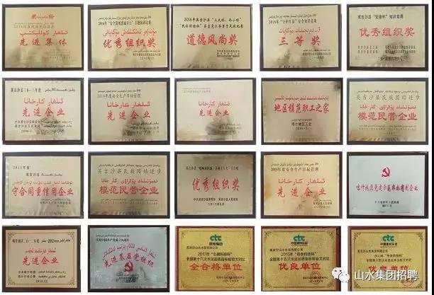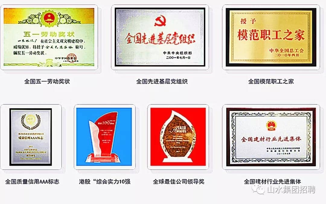多年來,山水集團先后被授予全國建材系統(tǒng)先進集體、全國五一勞動獎狀、全國先進基層黨組織、全國模范職工之家、山東省文明單位、山東省納稅百強企業(yè)、香港上市公司100強、中國500強、中國建材行業(yè)20強等榮譽稱號。