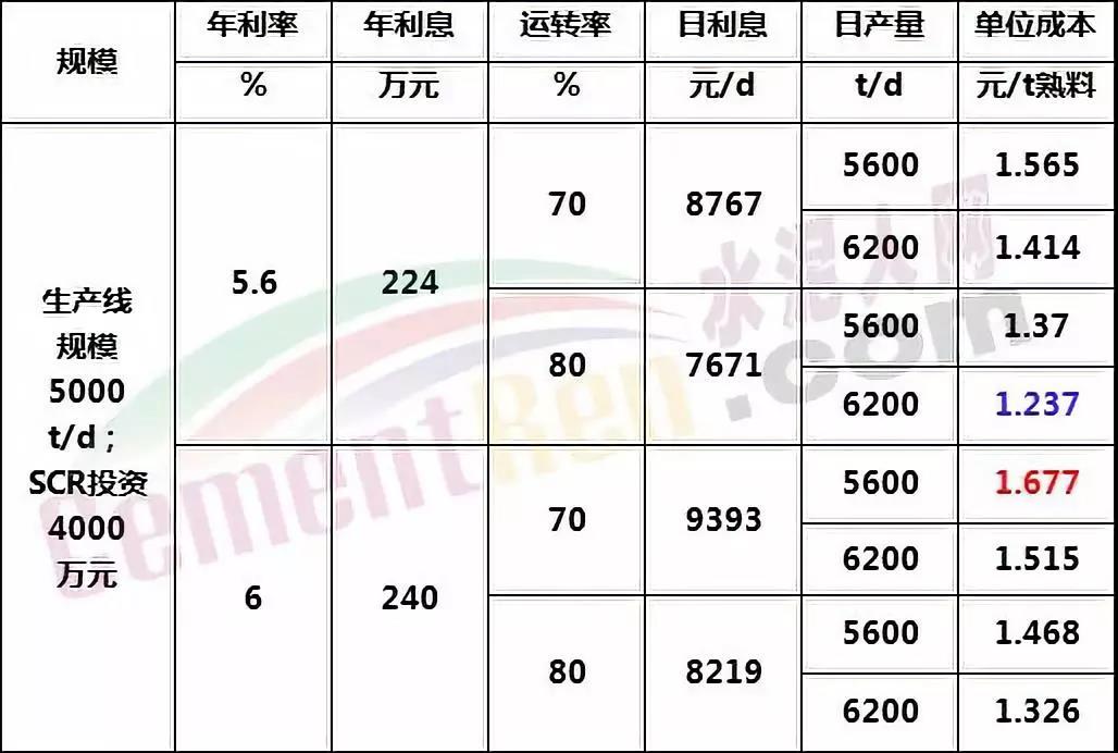 按5000t/d水泥窯脫硝考慮,幾種SCR脫硝的一次性投資按4000萬(wàn)元計(jì)算,現(xiàn)有一年期貸款利率考慮各企業(yè)貸款條件在5.6~6.0%之間,一年以后按滾動(dòng)還舊貸新,設(shè)定利率不變。