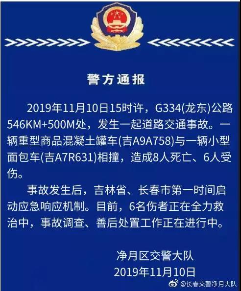 吉林省長春市凈月區(qū)交警大隊通報稱:2019年11月10日15時許,G334(龍東)公路546KM+500M處,發(fā)生一起道路交通事故。一輛重型商品混凝土罐車(吉A9A758)與一輛小型面包車(吉A7R631)相撞,造成8人死亡、6人受傷?! ∈鹿拾l(fā)生后,吉林省、長春市第一時間啟動應(yīng)急響應(yīng)機制。目前,6名傷者正在全力救治中,事故調(diào)查、善后處置工作正在進行中。 通報原文如下: