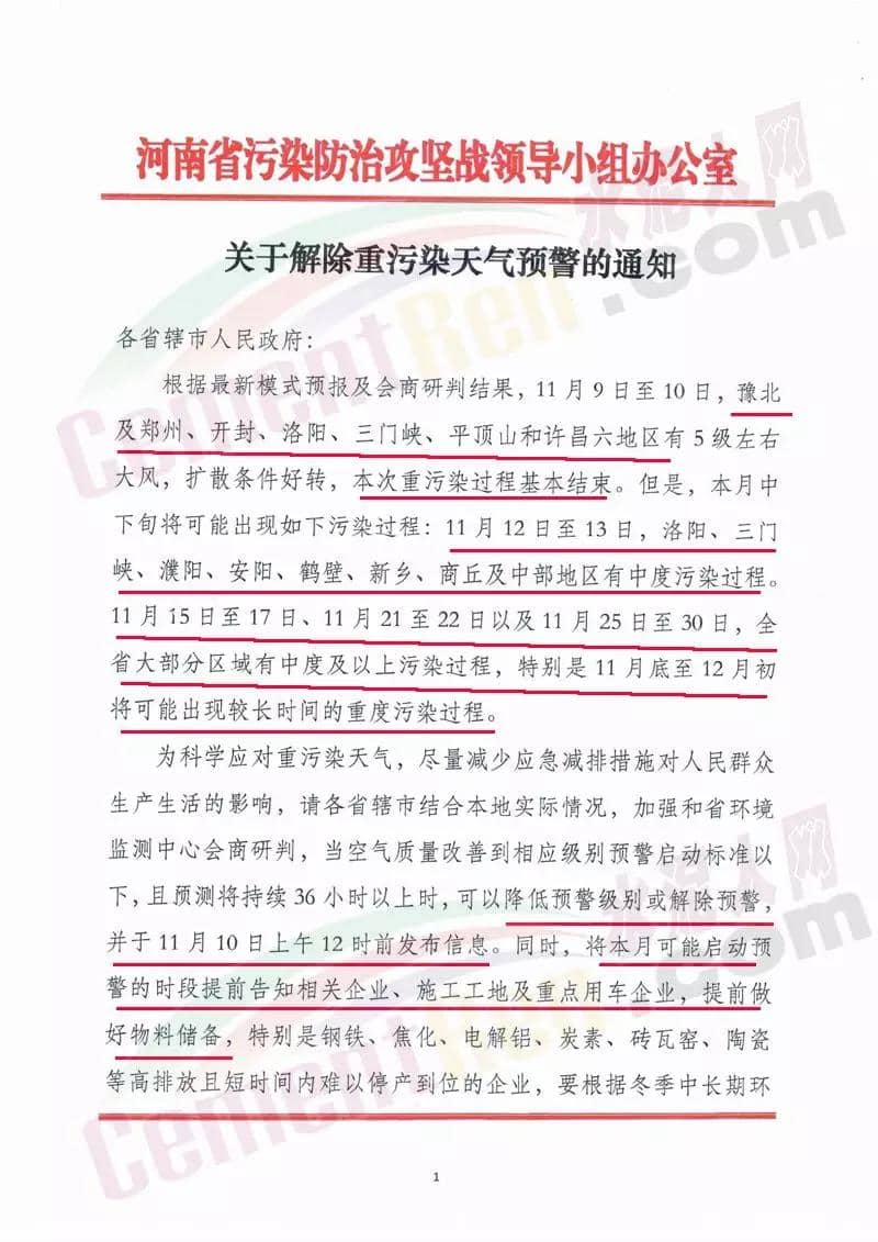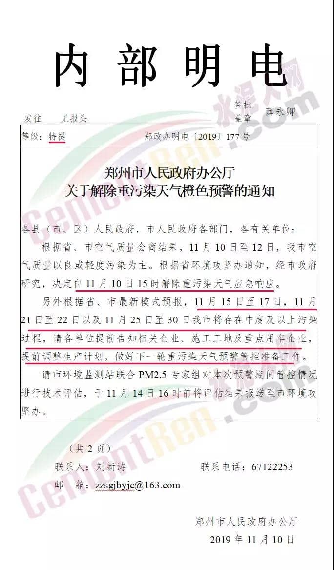 另外根據(jù)省、市最新模式預報,11月15日至17日,11月21日至22日以及11月25日至30日鄭州市將存在中度及以上污染過程,請各單位提前告知相關企業(yè)、施工工地及重點用車企業(yè),提前調(diào)整生產(chǎn)計劃,做好下一輪重污染天氣預警管控準備工作。文件原文如下: