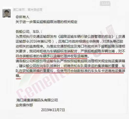 11月7日,??诟奂b箱碼頭有限公司業(yè)務(wù)操作部發(fā)布《關(guān)于進(jìn)一步落實(shí)超載超限治理的相關(guān)規(guī)定》通知稱,公司將拒絕為車輛超標(biāo)準(zhǔn)裝配貨,嚴(yán)禁超載超限車輛出港,對(duì)不符合裝載標(biāo)準(zhǔn)的車輛予以退箱處理并收取退箱費(fèi)。同時(shí),建議船公司向車隊(duì)派單時(shí),明確告知車隊(duì)需承運(yùn)的集裝箱的重要,車隊(duì)在獲知集裝箱的重后,應(yīng)使用符合軸數(shù)標(biāo)準(zhǔn)的車頭車卡進(jìn)港拖運(yùn)集裝箱。