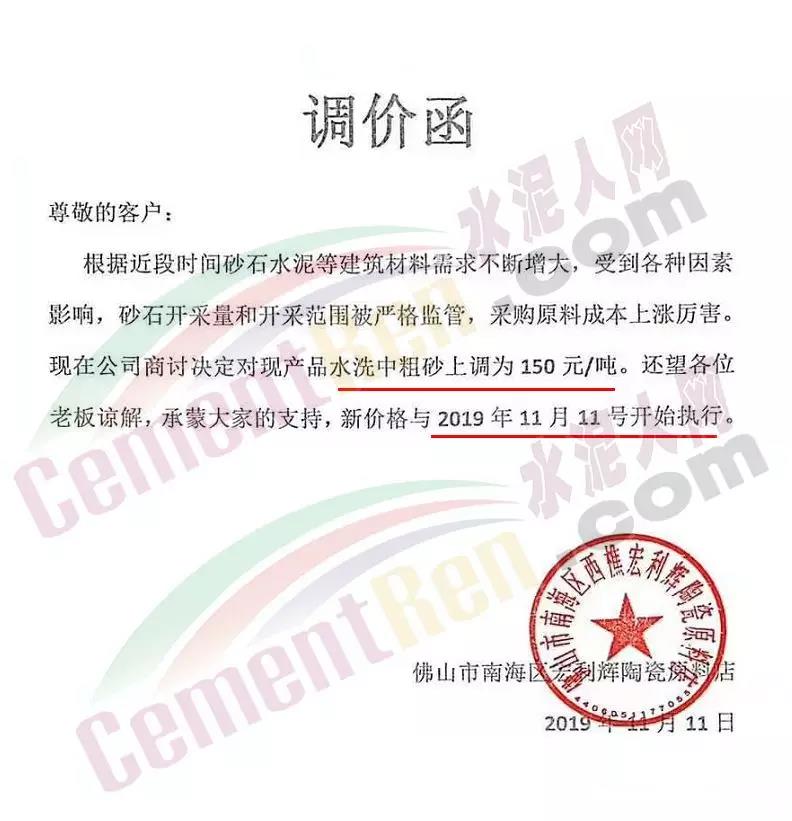 日前,廣東省佛山市南海區(qū)宏利輝陶瓷原料店發(fā)布調(diào)價(jià)函稱,根據(jù)近段時(shí)間砂石水泥等建材需求不斷增大,受各種因素影響,砂石開采量和開采范圍被嚴(yán)格監(jiān)管,采購原料成本上漲厲害。公司商討決定對(duì)產(chǎn)品水洗中粗砂上調(diào)為150元/噸。新價(jià)格與11月11日開始執(zhí)行。