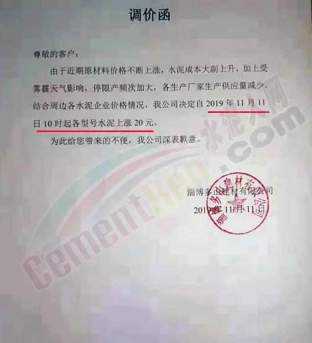 同期,山東省內(nèi)多家企業(yè)通知上調(diào)水泥價(jià)格,漲幅20元/噸。其中淄博多山建材有限公司調(diào)價(jià)通知稱由于近期原材料價(jià)格不斷上漲,水泥成本大幅上升,加上受重污染天氣影響,停限產(chǎn)頻次加大,各生產(chǎn)廠家生產(chǎn)供應(yīng)量減少。結(jié)合周邊各水泥企業(yè)價(jià)格情況,自11月11日10時(shí)起各型號(hào)水泥上漲20元/噸。
