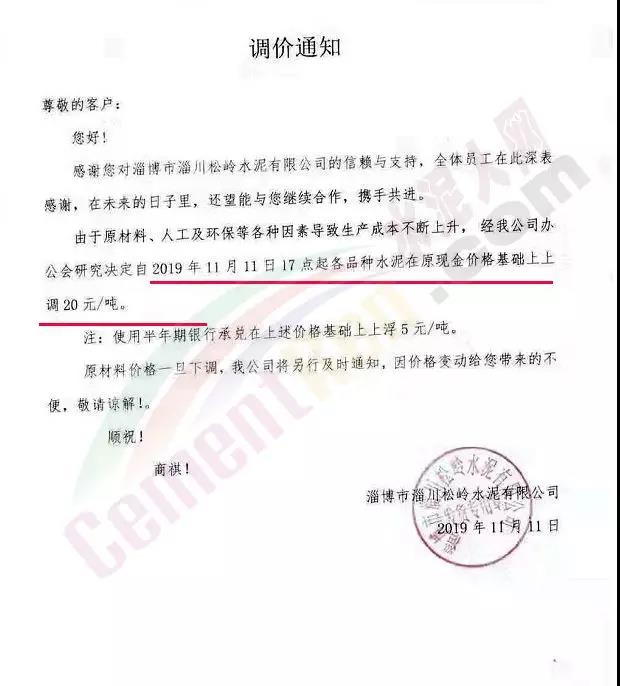 淄博魯中水泥有限公司調(diào)價(jià)函稱,根據(jù)當(dāng)前水