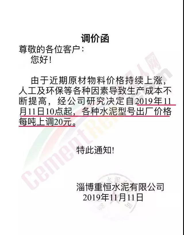 泥原燃材料(礦粉、煤炭、粉煤灰等)價(jià)格大幅上漲情況,同時(shí)環(huán)保預(yù)警停產(chǎn)越發(fā)頻繁,受11月15日錯(cuò)峰停產(chǎn)影響導(dǎo)致公司生產(chǎn)成本大幅上升,經(jīng)公司慎重研究決定 自11日早8時(shí)起,各品種水泥出廠價(jià)在現(xiàn)行價(jià)格基礎(chǔ)上上調(diào)20元/噸。