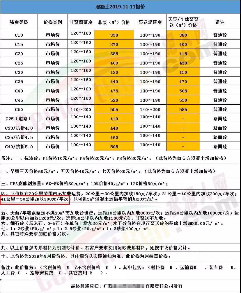 廣西區(qū)域某混凝土企業(yè)11月11日?qǐng)?bào)價(jià)顯示距離 41-50公里加收300元/方。C30非泵送報(bào)價(jià)最高420元/m³。與廣區(qū)江門地區(qū)價(jià)格相差210元/m³。
