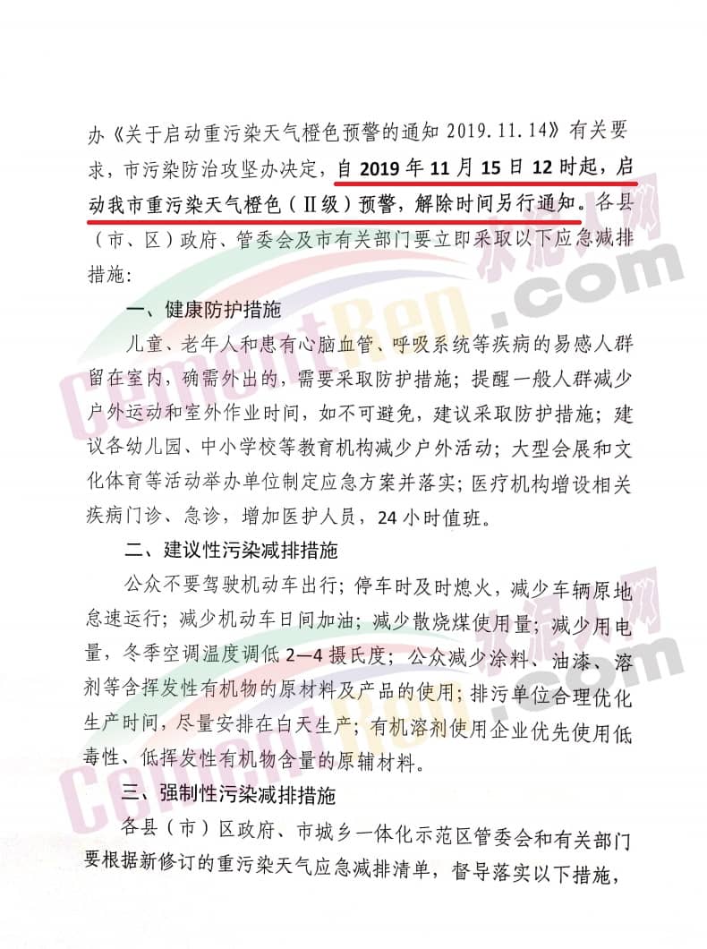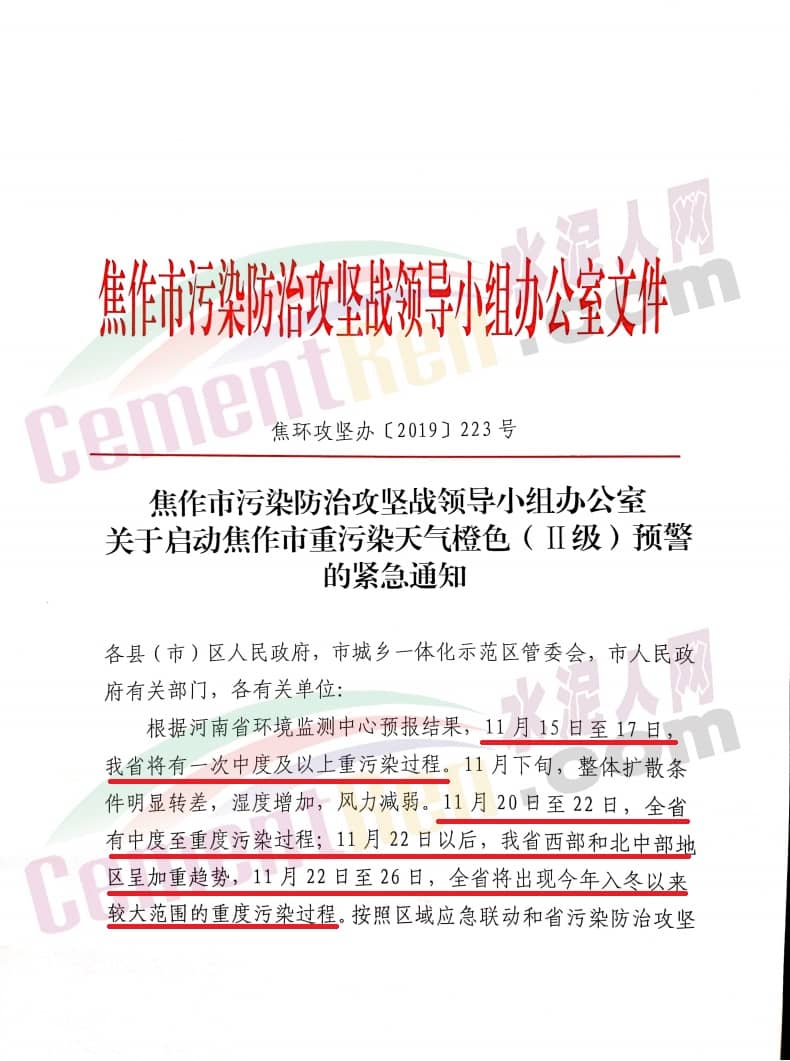 11月15日,焦作市生態(tài)環(huán)境局發(fā)布了《焦作市污染防治攻堅戰(zhàn)領導小組辦公室關于啟動焦作市重污染天氣橙色(Ⅱ級)預警的緊急通知 》稱自2019年11月15日12時起,啟動重污染天氣橙色(Ⅱ級)警,解除時間另行通知。通知原文如下: