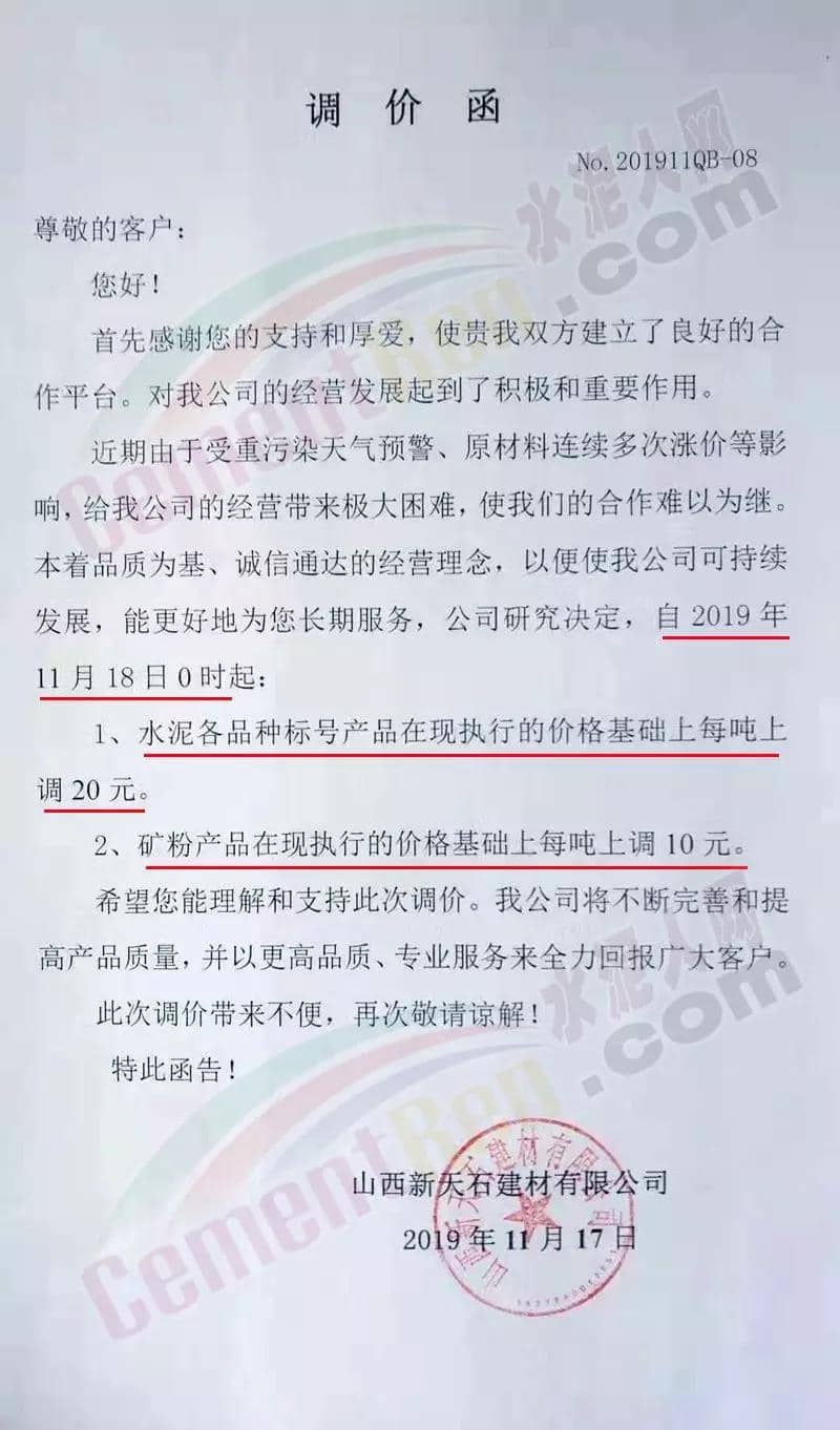 同一天,山西新天石建材有限公司發(fā)調(diào)價函稱,近期由于受重污染天氣預警、原材料連續(xù)多次漲價等影響,給公司的經(jīng)營帶來極大困難。經(jīng)公司研究決定自今日(11月18日)0時起:水泥各品種標號產(chǎn)品在現(xiàn)執(zhí)行的價格基礎(chǔ)上每噸上調(diào)20元;礦粉產(chǎn)品在現(xiàn)執(zhí)行價格基礎(chǔ)上每噸上調(diào)10元。
