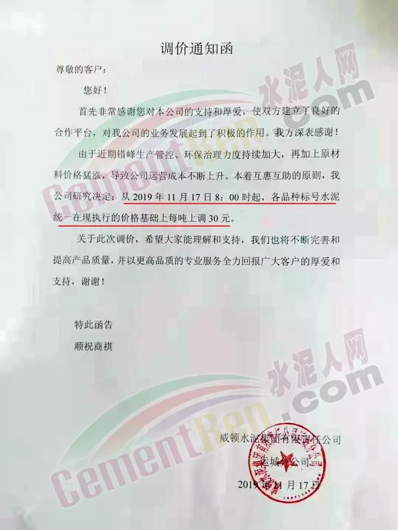 威頓水泥調(diào)價通知函稱,由于近期錯峰生產(chǎn)管控、環(huán)保治理力度持續(xù)加大,再加上原材料價格猛漲,導致公司運營成本不斷上升。經(jīng)公司研究決定 自11月17日早8時起,各品種標號水泥統(tǒng)一在現(xiàn)執(zhí)行的價格基礎(chǔ)上每噸上調(diào)30元。