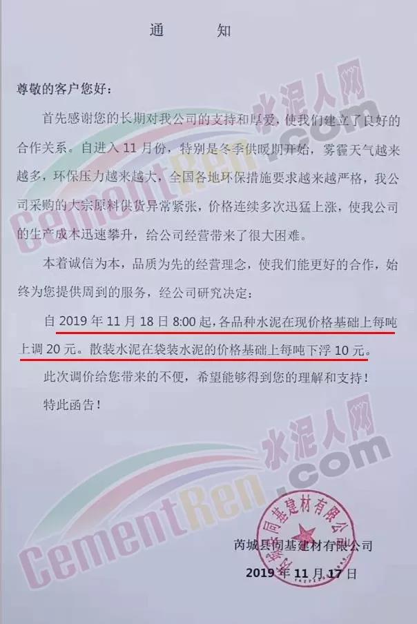 據(jù)水泥人網(wǎng)了解,山西區(qū)域繼區(qū)域主導(dǎo)企業(yè)聞喜冀東、威頓水泥等上調(diào)水泥價(jià)格后,區(qū)域內(nèi)其他企業(yè)陸續(xù)跟漲。山西省運(yùn)城市芮城縣同基建材有限公司調(diào)價(jià)通知稱,自進(jìn)入11月份,特別是冬季供暖期開(kāi)始,霧霾天氣越來(lái)越多,環(huán)保壓力越來(lái)越大,全國(guó)各地環(huán)保措施要求越來(lái)越嚴(yán)格。公司采購(gòu)的大宗原料供貨異常緊張,價(jià)格連續(xù)多次迅猛上漲,使公司生產(chǎn)成本迅速攀升,給公司經(jīng)營(yíng)帶來(lái)很大困難。經(jīng)公司研究決定 ,自11月18日8時(shí)起,各品種水泥在現(xiàn)價(jià)格基礎(chǔ)上每噸上調(diào)20元。