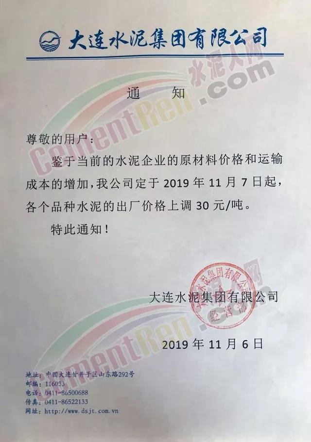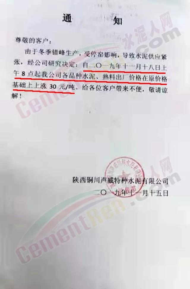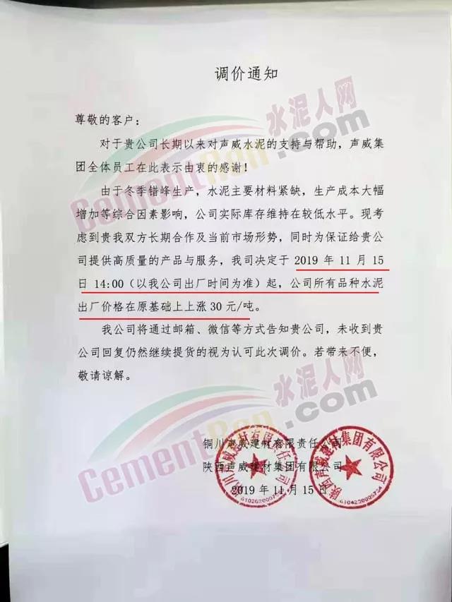 天津市金晟華水泥股份有限公司調(diào)價(jià)通知稱,近期錯(cuò)峰生產(chǎn),道路運(yùn)輸治理、環(huán)保停工等多因素影響,致使水泥各種原材料價(jià)格上漲,受此影響水泥制造成本不斷增加,為保障公司正常生產(chǎn)運(yùn)行,經(jīng)公司研究決定自11月18日9時(shí)起對(duì)PO42.5級(jí)水泥出廠價(jià)上調(diào)20元/噸。