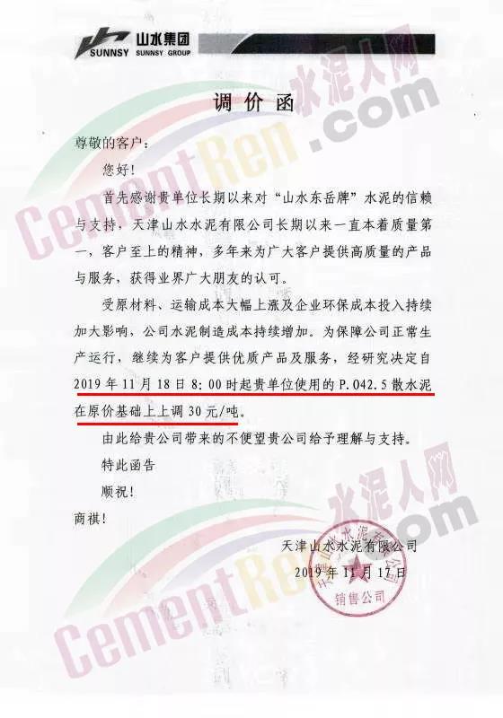 天津山水水泥調(diào)價(jià)函稱,受原材料、運(yùn)輸成本大幅上漲及企業(yè)環(huán)保成本投入持續(xù)加大影響,公司水泥制造成本持續(xù)增加。為保障公司正常生產(chǎn)運(yùn)行,繼續(xù)為客戶提供優(yōu)質(zhì)產(chǎn)品服務(wù),經(jīng)研究決定自11月18日8時(shí)起PO42.5散裝水泥價(jià)格在原價(jià)格基礎(chǔ)上上調(diào)30元/噸。