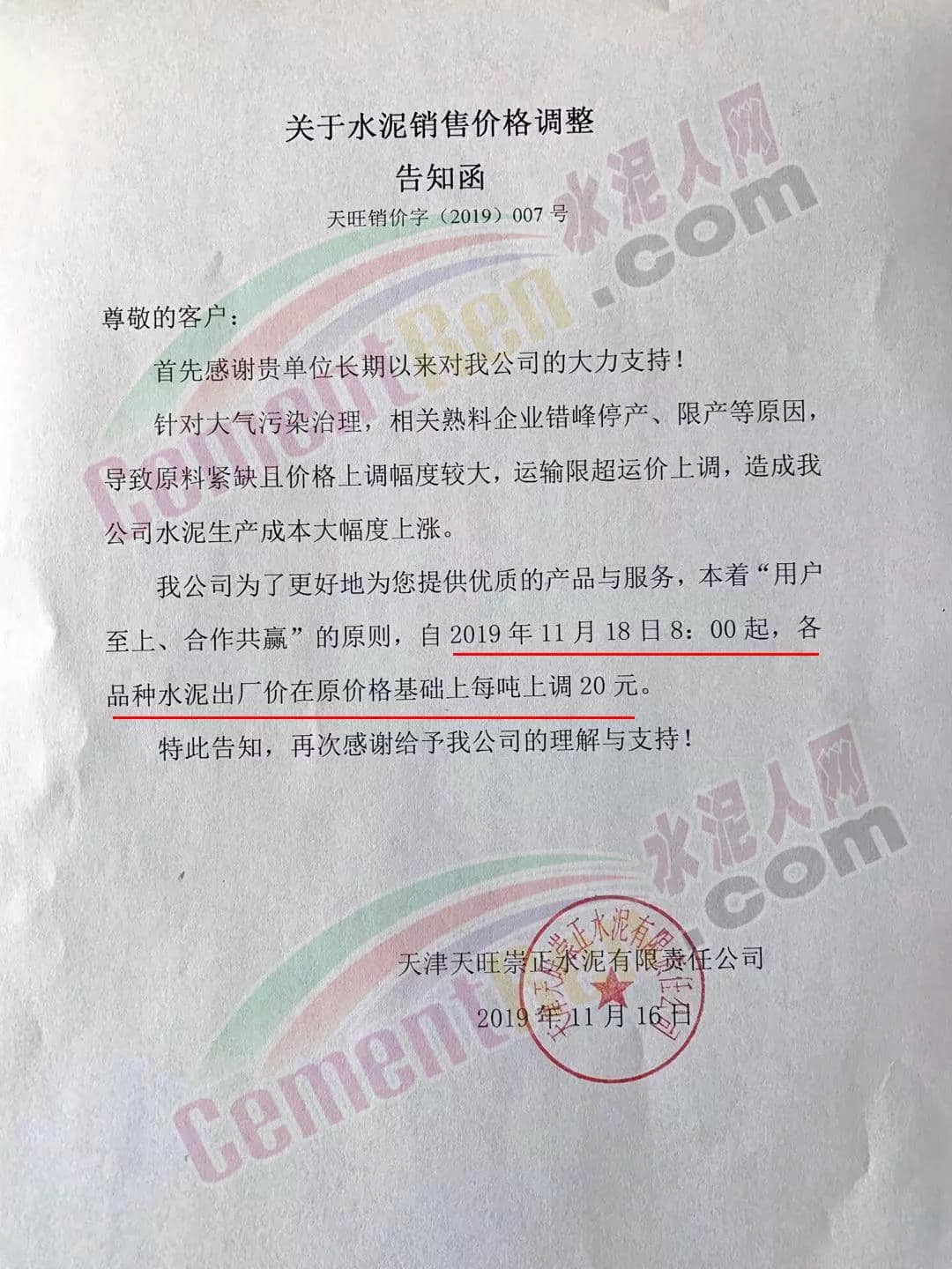 天津天旺崇正水泥有限責(zé)任公司關(guān)于水泥銷售主價(jià)格調(diào)整的告知函稱,針對(duì)大氣污染治理,相關(guān)熟料企業(yè)錯(cuò)峰停產(chǎn)、限產(chǎn)等原因?qū)е略暇o缺且價(jià)格上調(diào)幅度較大,運(yùn)輸限超運(yùn)價(jià)上調(diào),造成我公司水泥生產(chǎn)成本大幅度上漲。公司決定自11月18日8時(shí)起各品種水泥出廠價(jià)在原價(jià)格基礎(chǔ)上每噸上調(diào)20元。