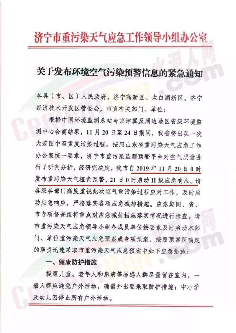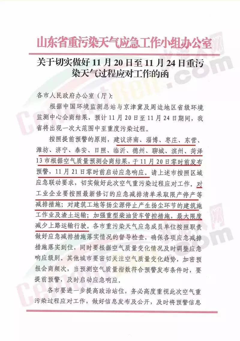 11月19日山東省重污染天氣應(yīng)急工作小組辦公室發(fā)布通知,建議濟(jì)南、淄博 、棗莊、東營(yíng)、維坊、濟(jì)寧、泰安、日照、臨沂、德州、聊城、濱州、菏澤13市根據(jù)空氣質(zhì)量預(yù)測(cè)會(huì)商結(jié)果,于11月20日零時(shí)前發(fā)布預(yù)警,11月21日零時(shí)前應(yīng)動(dòng)應(yīng)急響應(yīng)。預(yù)警期間對(duì)工業(yè)企業(yè)要按照最新修訂的應(yīng)急減排清單采取限產(chǎn)停產(chǎn)等減排措施;對(duì)建筑 工地等揚(yáng)塵源停止產(chǎn)能揚(yáng)塵環(huán)節(jié)的建筑施工作業(yè)及渣土運(yùn)輸;加強(qiáng)重型柴油貨車(chē)管控措施,最大限度減少上路運(yùn)輸行駛等。