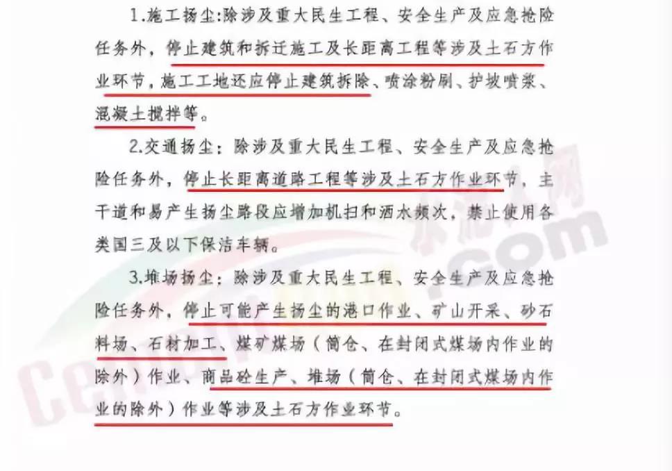 3.除涉及重大民生工程、安全生產(chǎn)及應(yīng)急搶險(xiǎn)任務(wù)外,停止所有施工工地的土石方作業(yè)(包括停止土石方開(kāi)挖、回填、場(chǎng)內(nèi)倒運(yùn)、摻拌石灰、混凝土剔鑿等作業(yè),停止建筑工程配套道路和管溝開(kāi)挖作業(yè))。