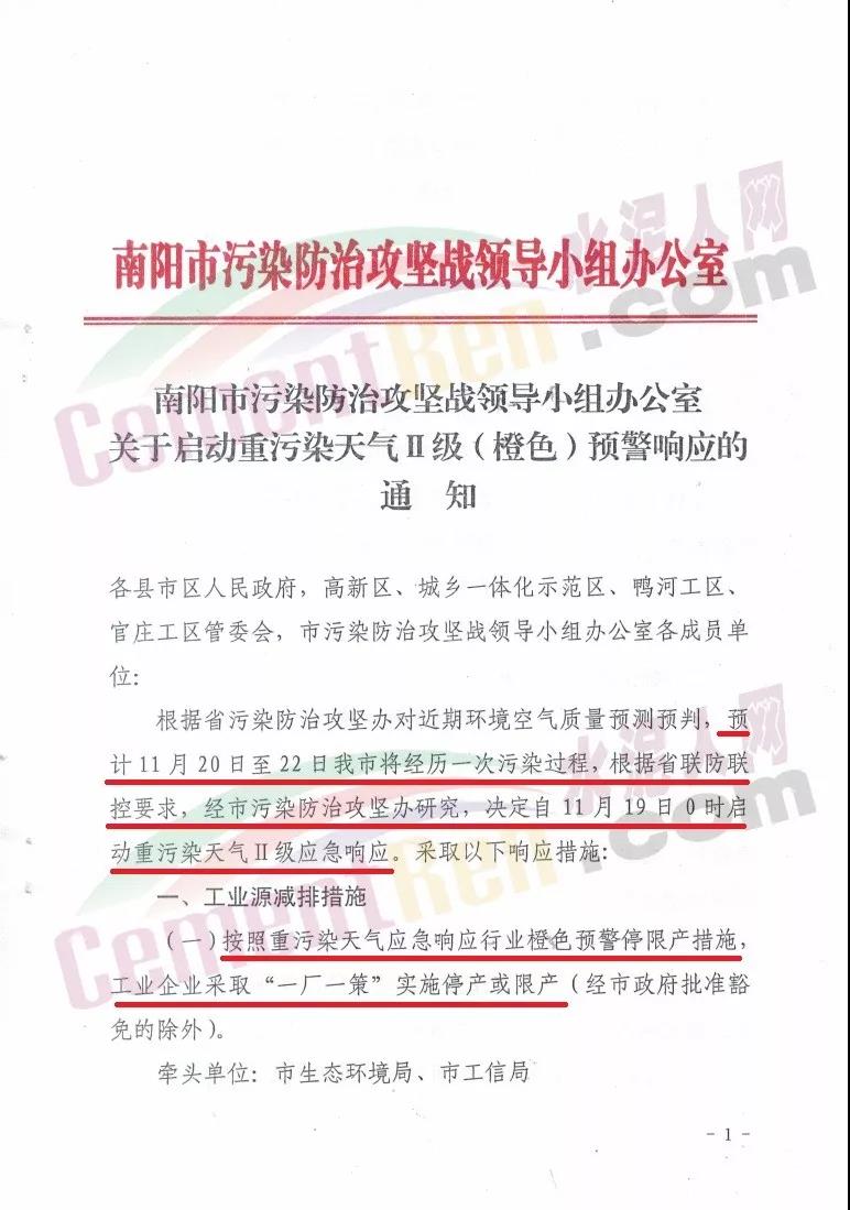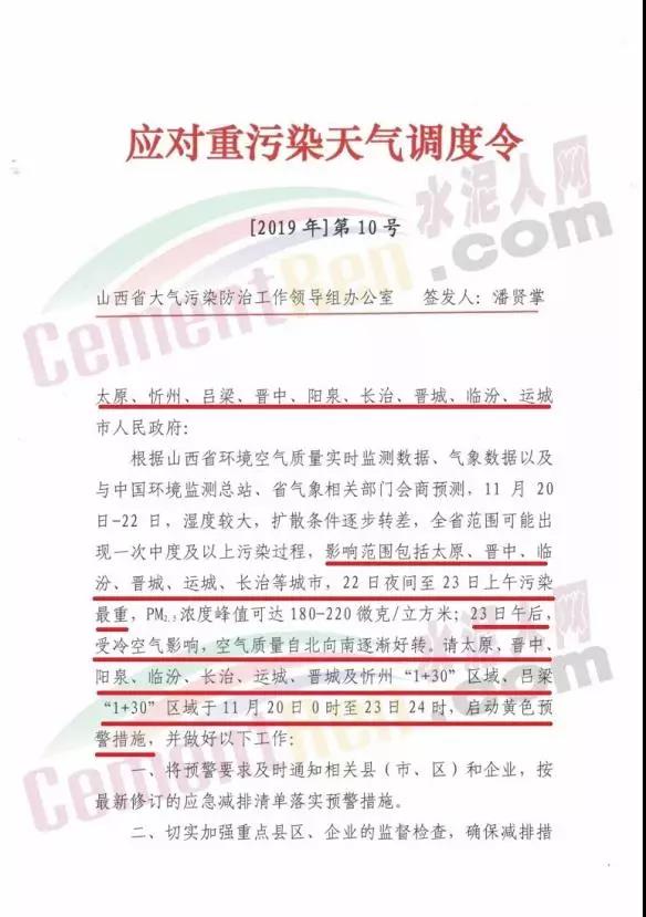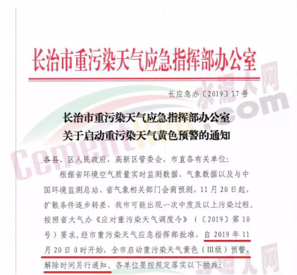 長(zhǎng)治市重污染天氣應(yīng)急指按部辦公室通知文件要求自11月20日0時(shí)開(kāi)始全市啟動(dòng)重污染天氣黃色(III級(jí))預(yù)警,要求水泥、建材行業(yè)停產(chǎn)。