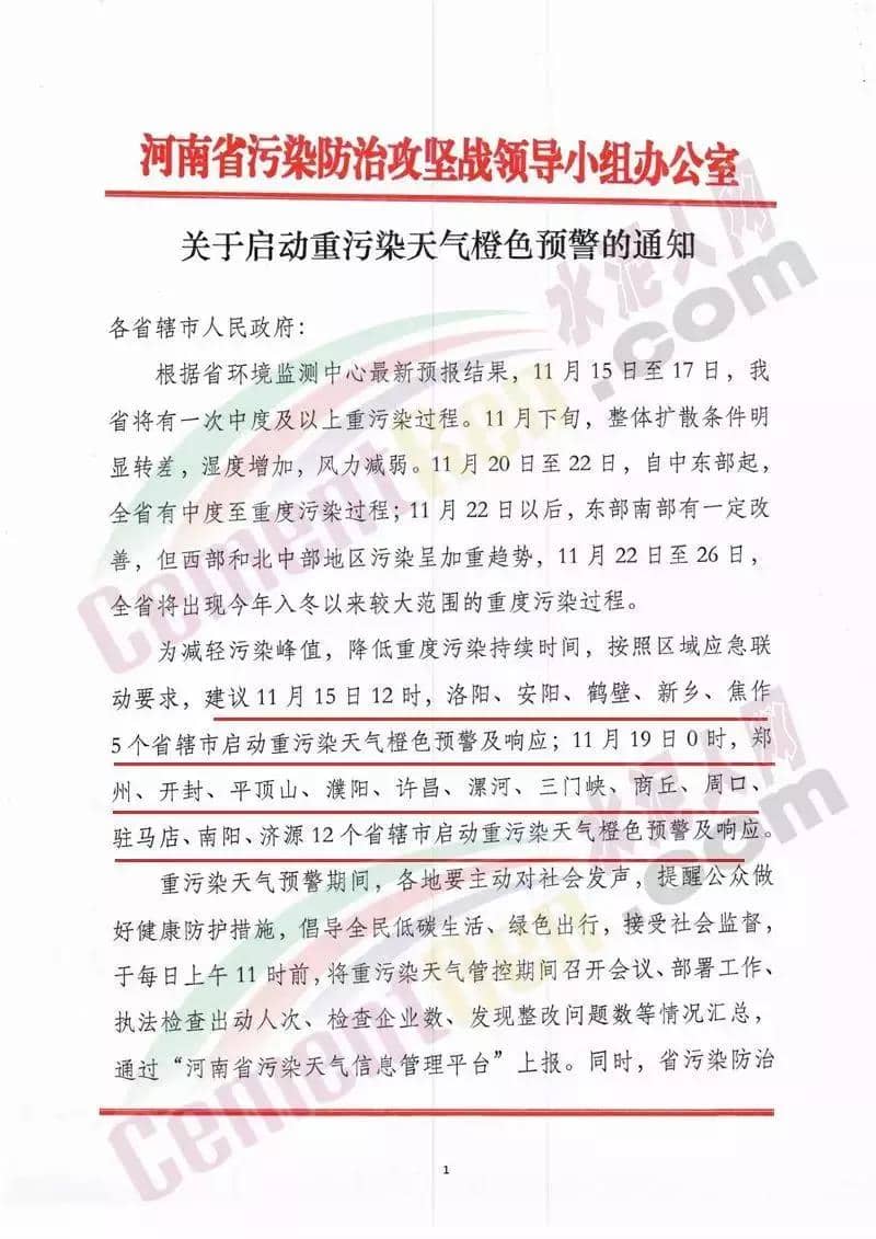 河南南省污染防治攻堅(jiān)戰(zhàn)領(lǐng)導(dǎo)小組辦公室建議今日11月15日12時(shí),洛陽(yáng)、安陽(yáng)、鶴壁、新鄉(xiāng)、焦作5個(gè)省轄市啟動(dòng)重污染天氣橙色預(yù)警及響應(yīng);11月19日0時(shí),鄭州、開(kāi)封、平頂山、濮陽(yáng)、許昌、漯河、三門(mén)峽、商丘、周口、駐馬店、南陽(yáng)、濟(jì)源12個(gè)省轄市啟動(dòng)重污染天氣橙色預(yù)警及II響應(yīng)。